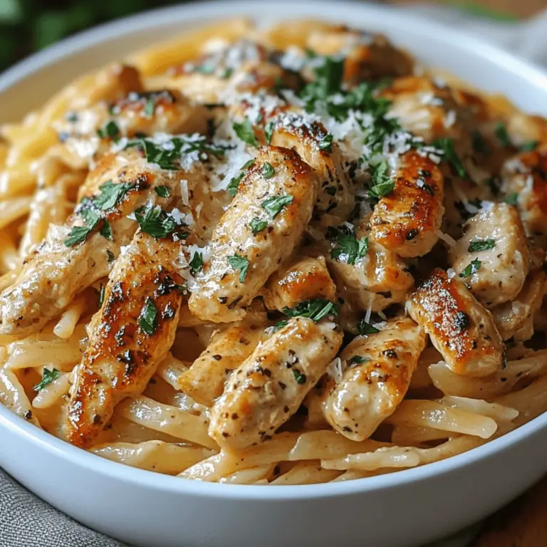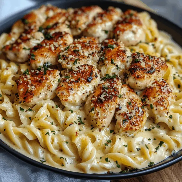 A creamy and cheesy pasta dish with tender chicken, garlic, and parmesan.