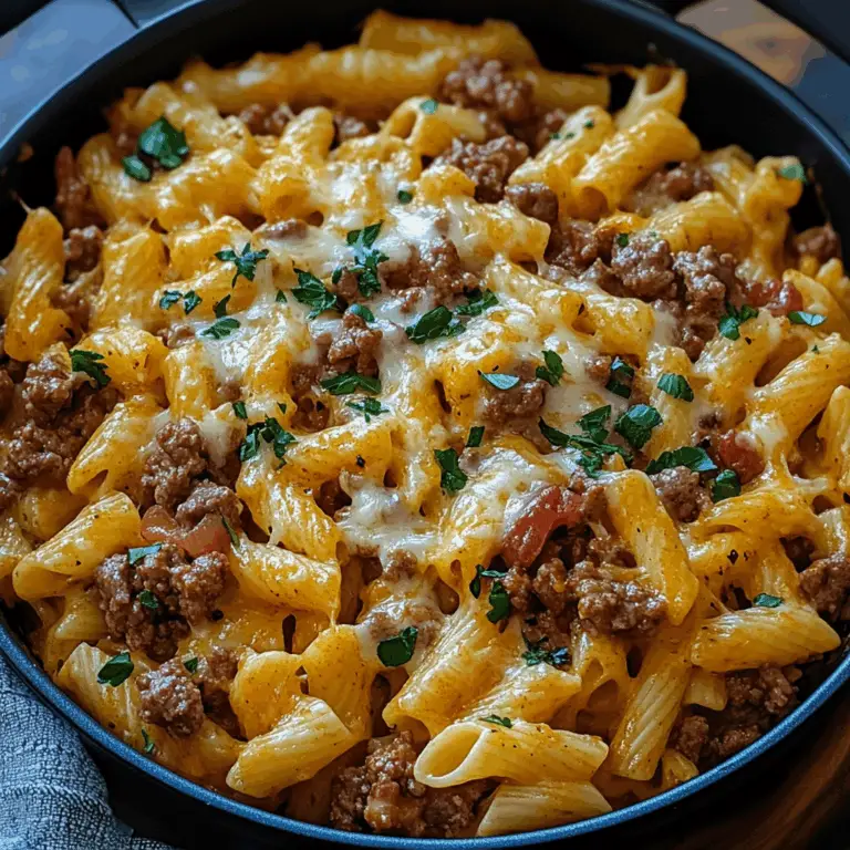 A quick and easy one-pot pasta dish with beef, cheddar cheese, and ranch dressing.