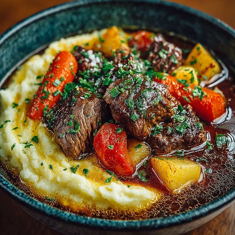 - Spoon mashed potatoes into bowls, ladle stew over the top, and sprinkle with chives.0.75 lb Top sirloin cubes