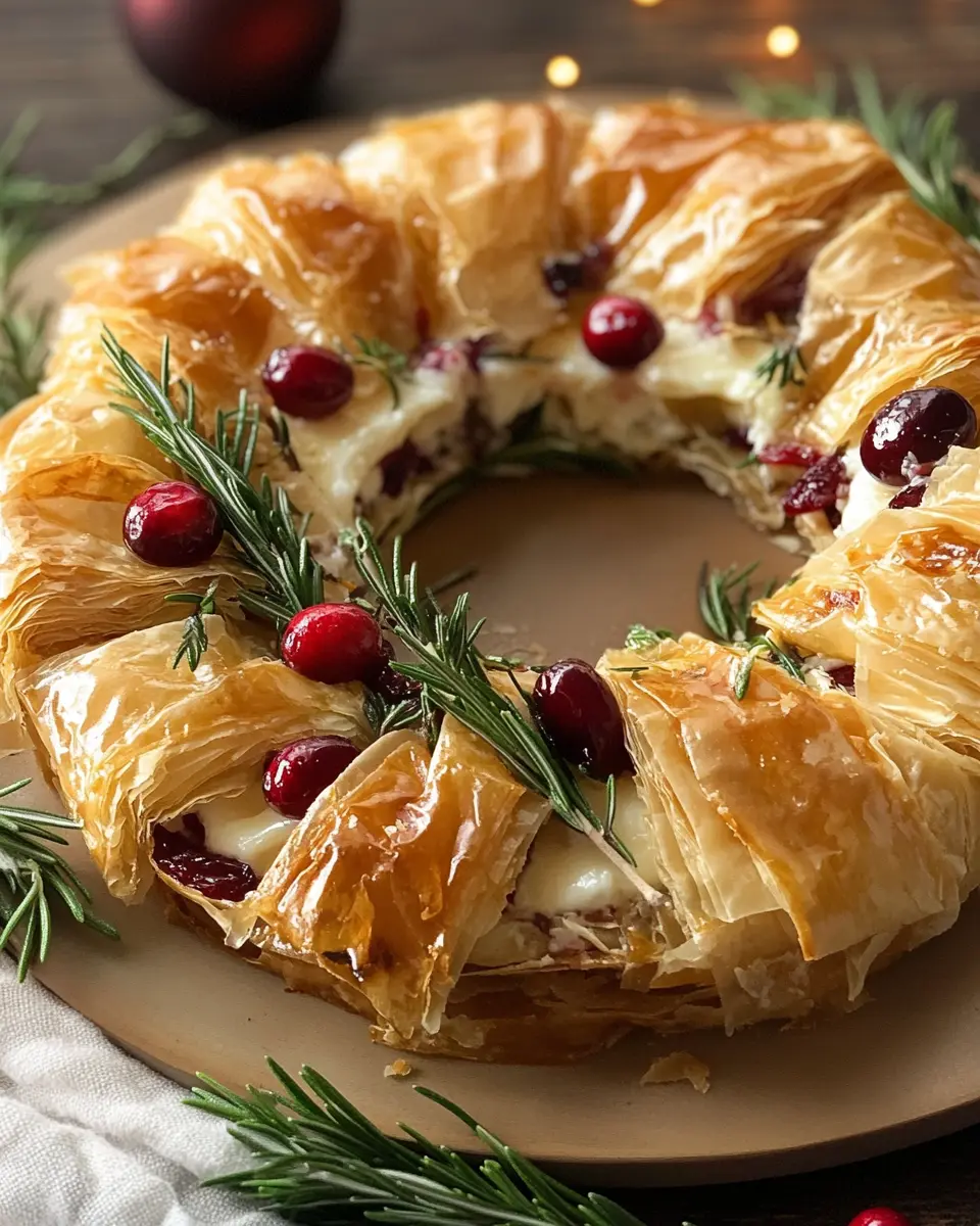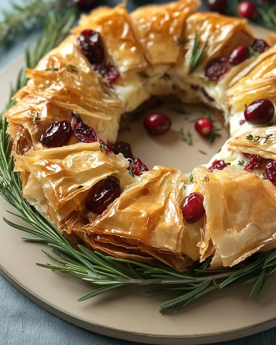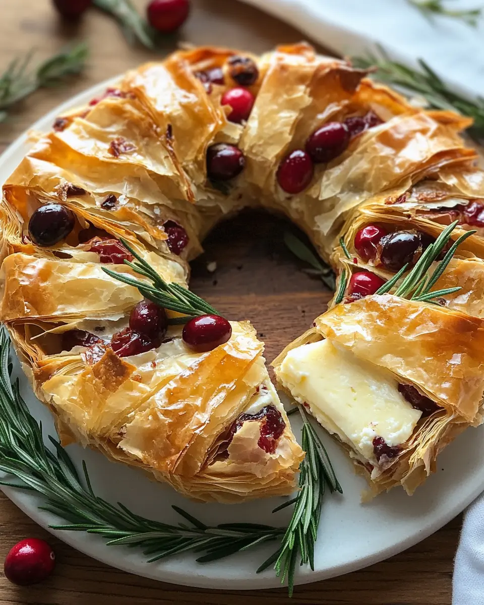 This Baked Brie Phyllo Wreath is a delicious and sophisticated appetizer perfect for holiday gatherings or special occasions.