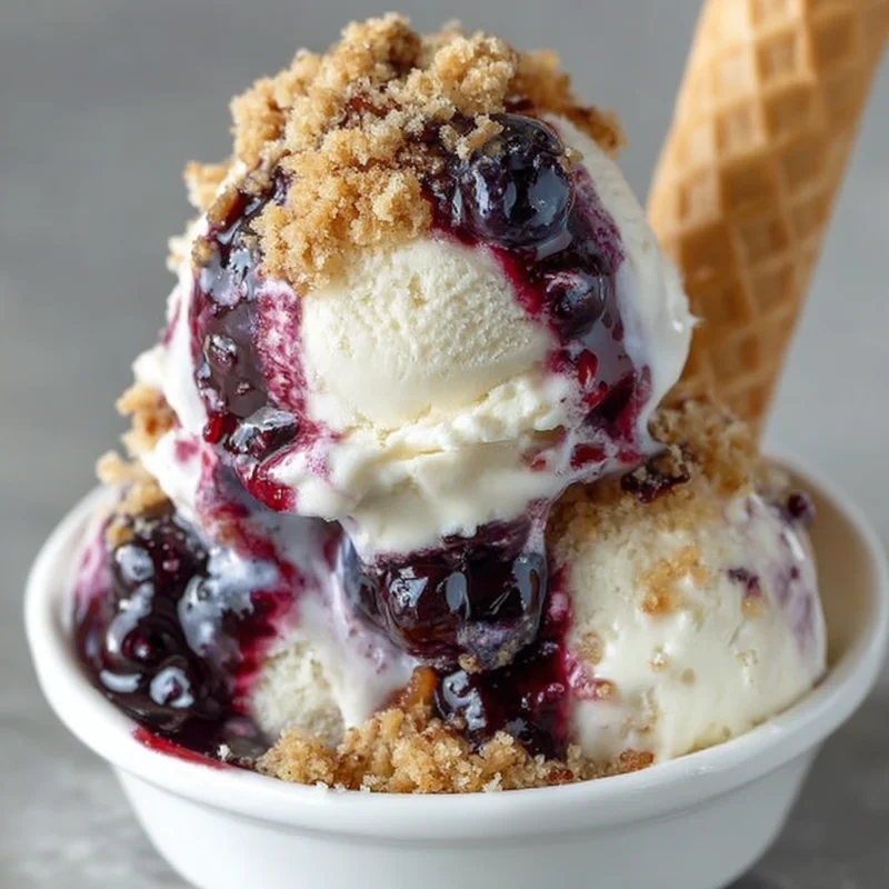 - The moment we've all been waiting for! Grab a freezer-safe container. We're going to layer this like a masterpiece. Dollop some of your freshly churned vanilla ice cream into the container. Then, spoon some of that gorgeous, cooled blueberry compote over the top. Sprinkle a generous amount of your cooled, crunchy crumble. Gently swirl it all together with a knife or a spoon – don't overmix, we want those beautiful streaks! Repeat the layering process until your container is full. Pop it into the freezer for at least 4 hours, or until it's nice and firm. And there you have it – your very own Blueberry Crumble Ice Cream!