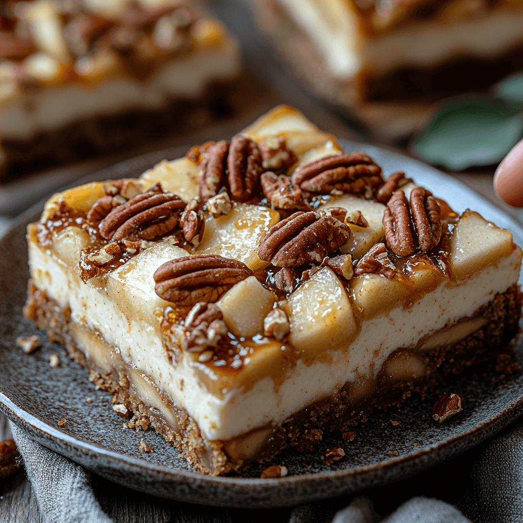 When you’re ready to serve, remove the cheesecake bars from the pan and slice them into squares. You can use a sharp knife to carefully cut through the bars, making sure to cut all the way through the crust and filling. Garnish with a few extra chopped pecans or apple slices for added flair, if desired.
