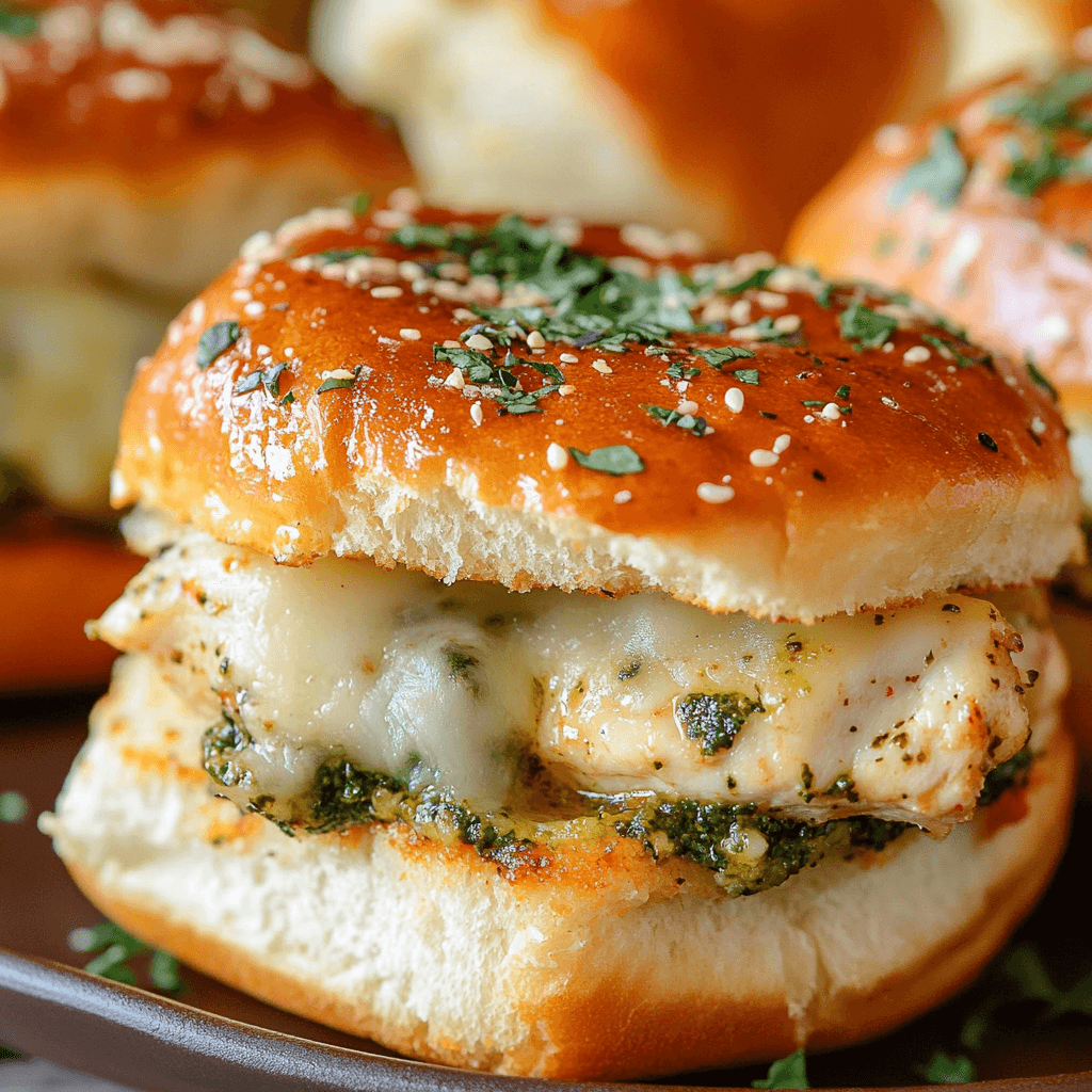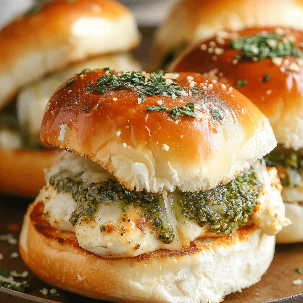 Juicy chicken breast topped with creamy pesto, melted cheese, and served on mini slider buns.