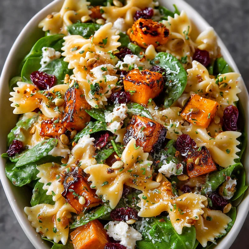 - In a large bowl, combine cooled pasta, roasted butternut squash, toasted pumpkin seeds, baby spinach, crumbled goat cheese, and dried cranberries.
