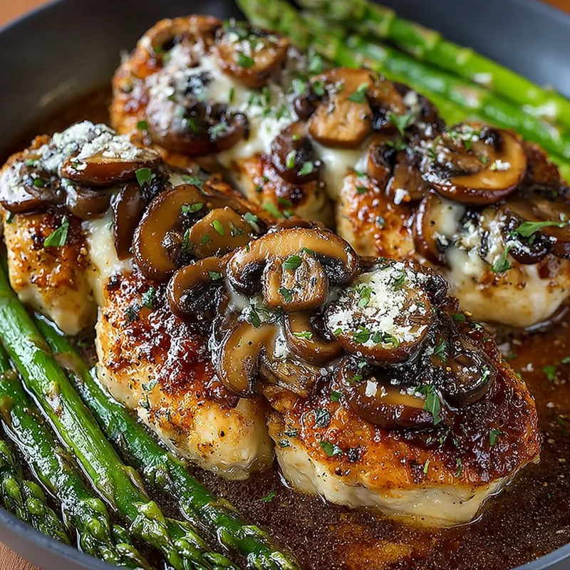 - Serve and Enjoy! Spoon the chicken, mushrooms, asparagus, and that luscious sauce onto plates. Finish with a generous sprinkle of shaved Parmesan cheese. Ta-da! Dinner is served!4 boneless, skinless chicken breasts