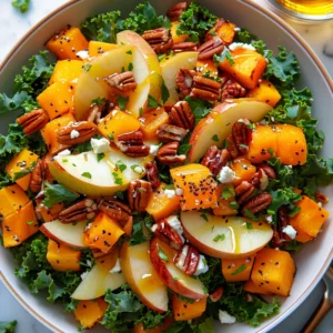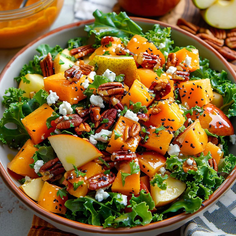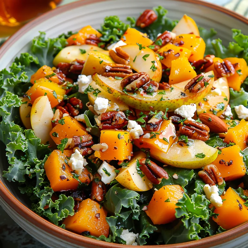 - In a large salad bowl, combine chopped kale, sliced apple, sliced pear, crumbled goat cheese, and pecans.0.5 piece Butternut squash
