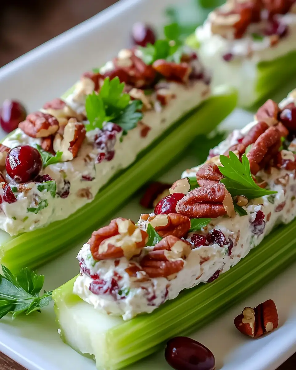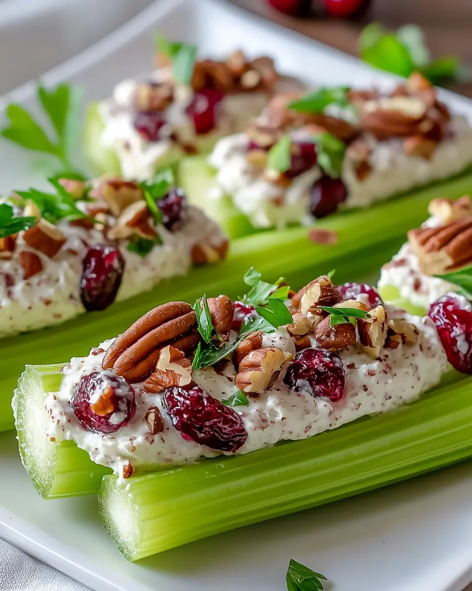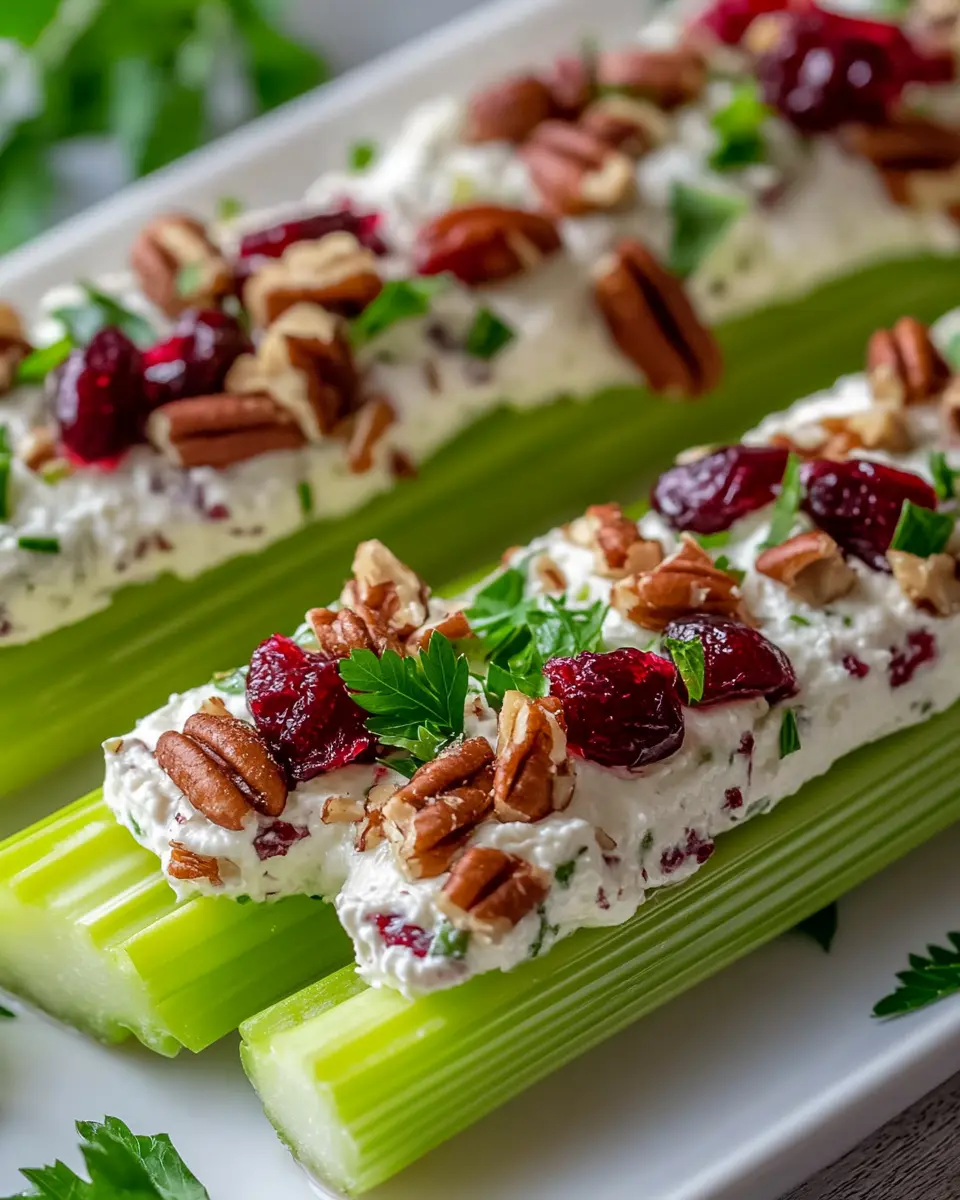 A delicious and easy appetizer featuring crunchy celery sticks filled with a creamy, sweet mixture of cream cheese, cranberries, and pecans.