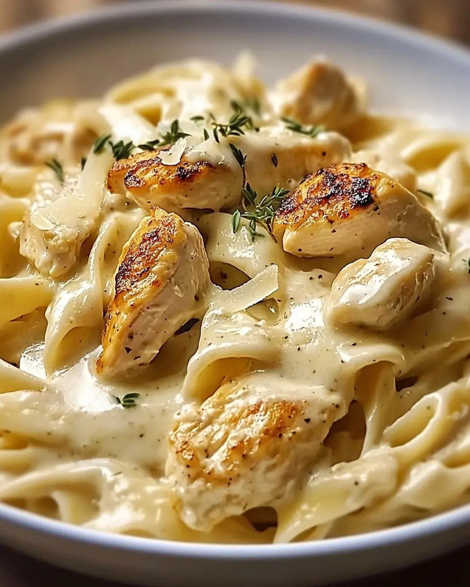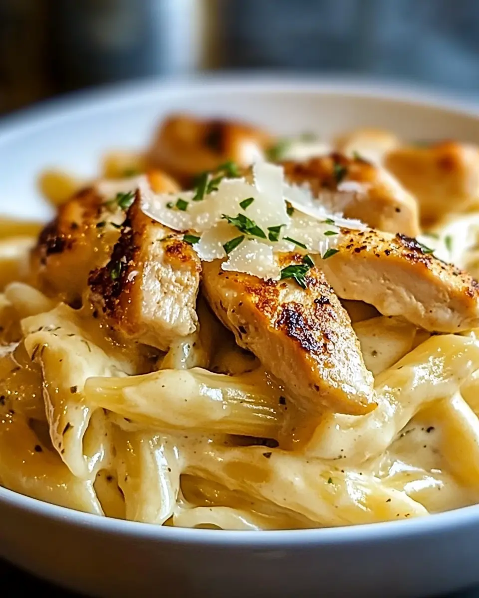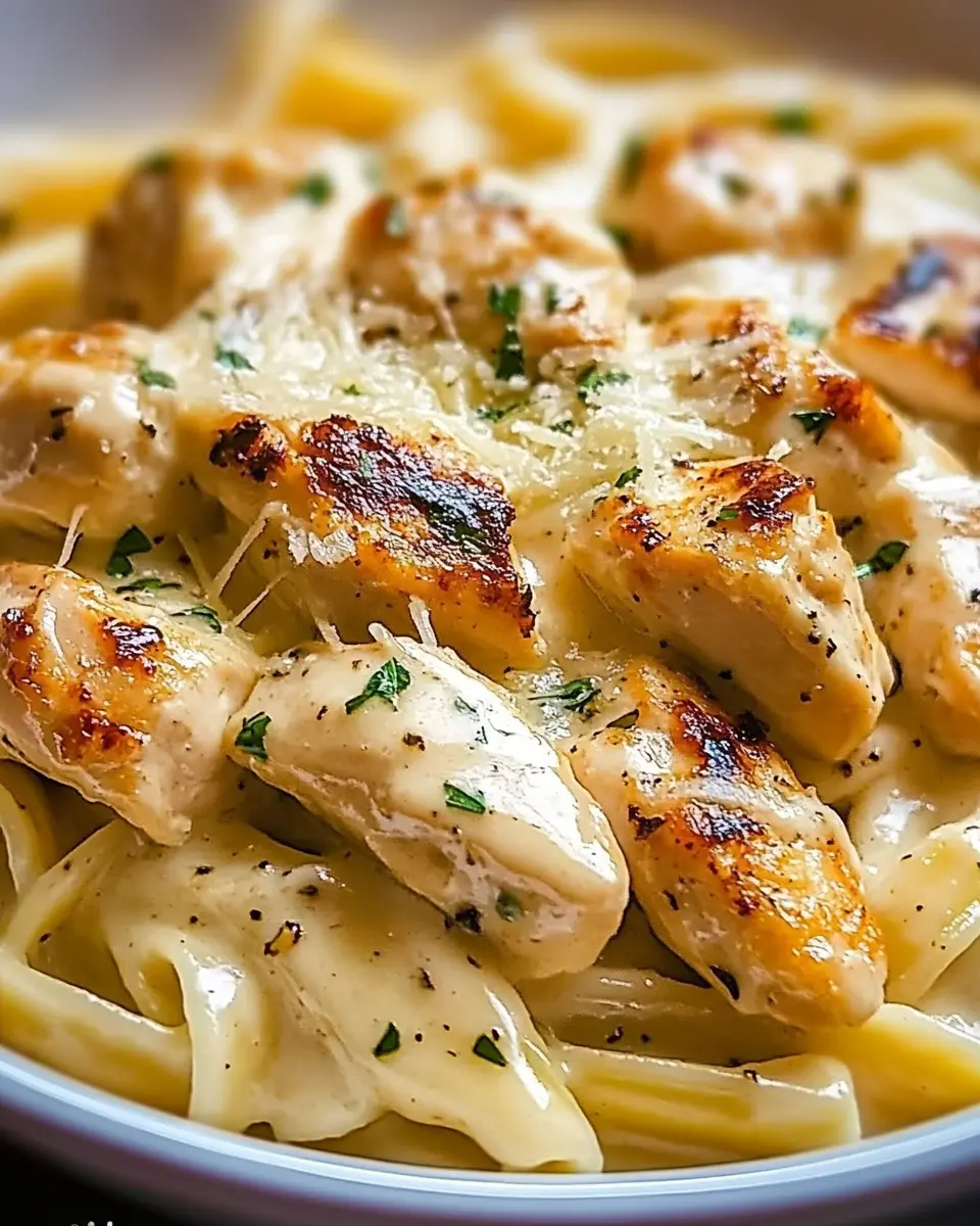 A delicious and creamy pasta dish featuring garlic, Parmesan cheese, and chicken.