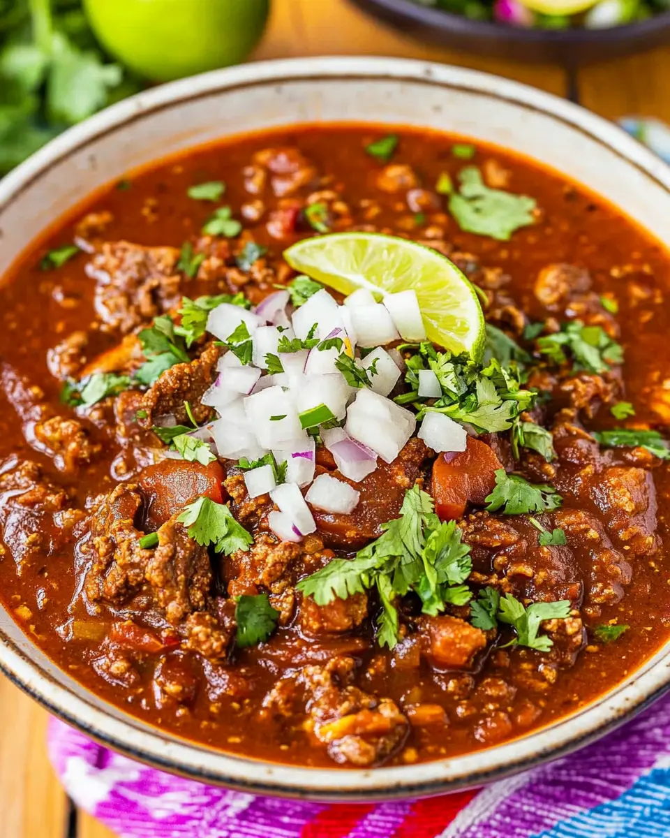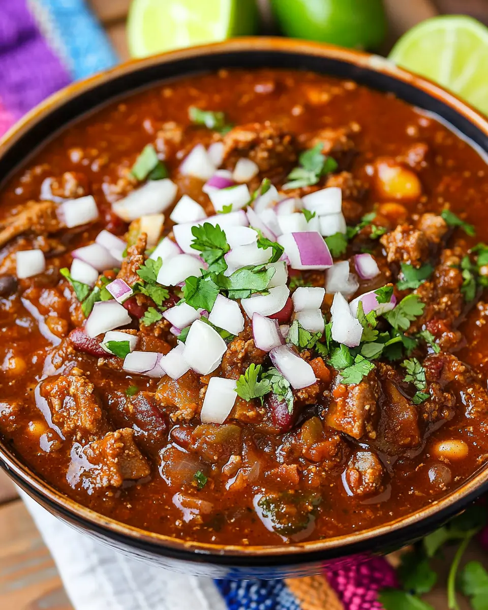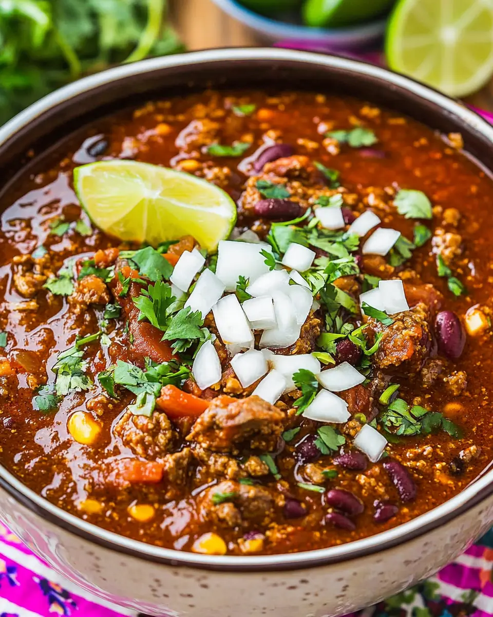 A delicious and hearty chili made with tender beef and rich spices, perfect for cozy dinners.