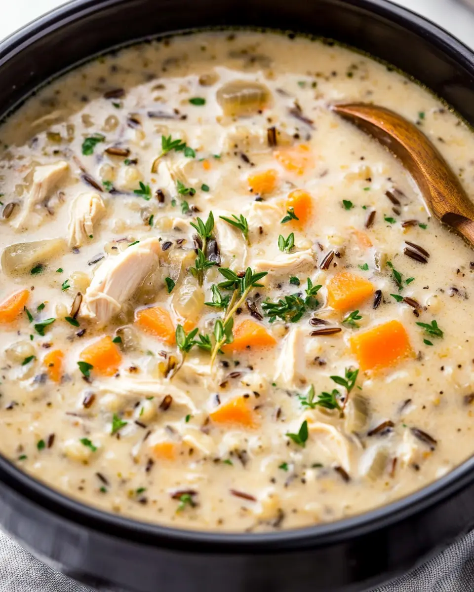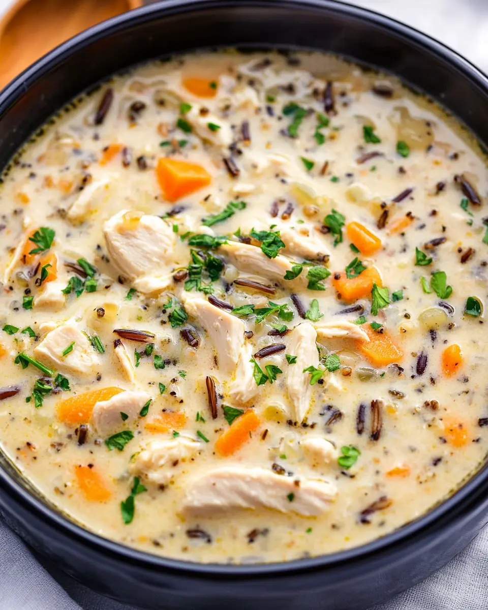 A comforting and hearty soup made with tender chicken, wild rice, and a variety of vegetables, perfect for a cozy meal.