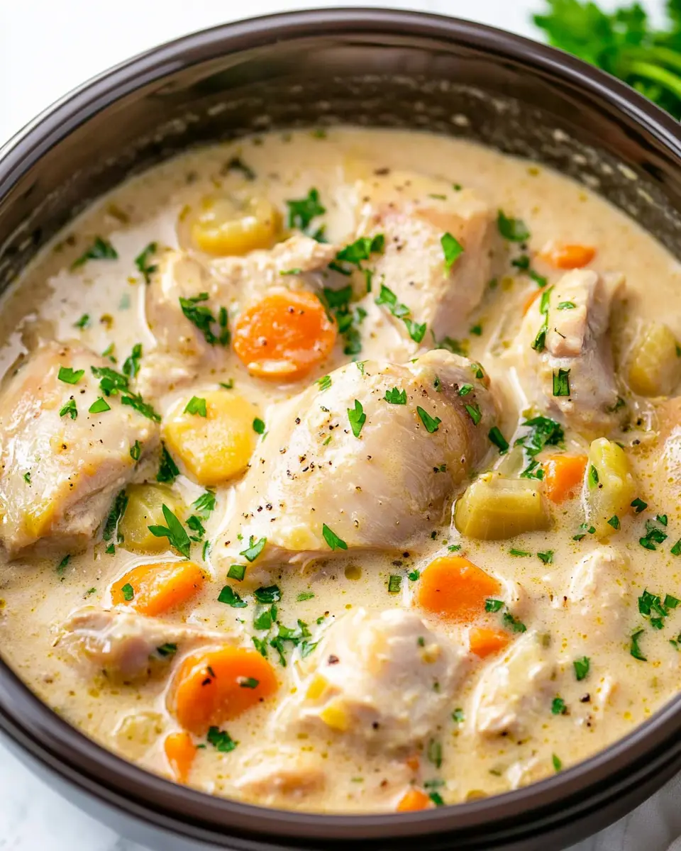 A hearty and creamy chicken stew made with tender thighs and delicious vegetables.