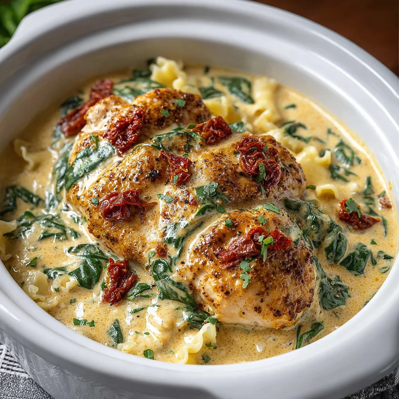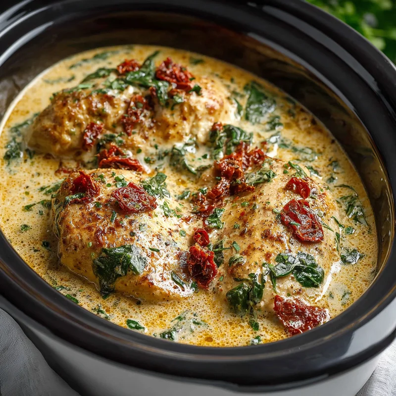 - Sauce Shower: Carefully pour this delicious Tuscan cream sauce evenly over the chicken in the crockpot. Make sure it covers everything beautifully.