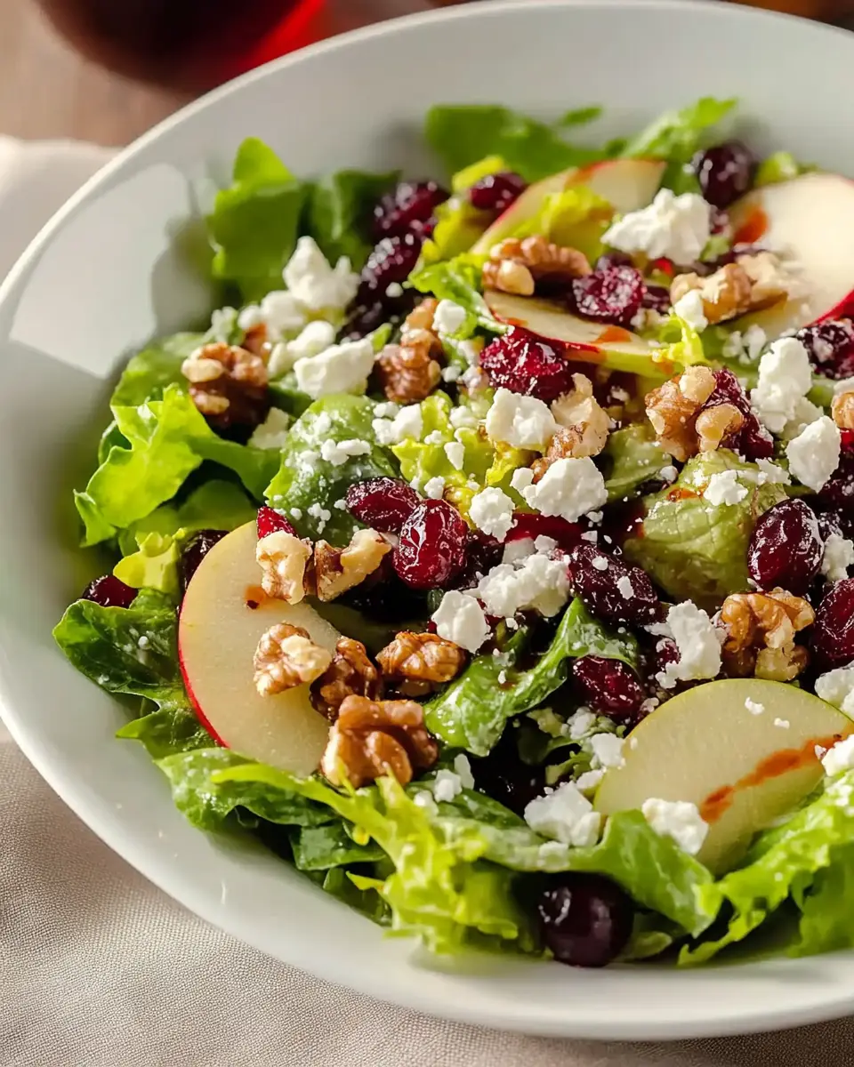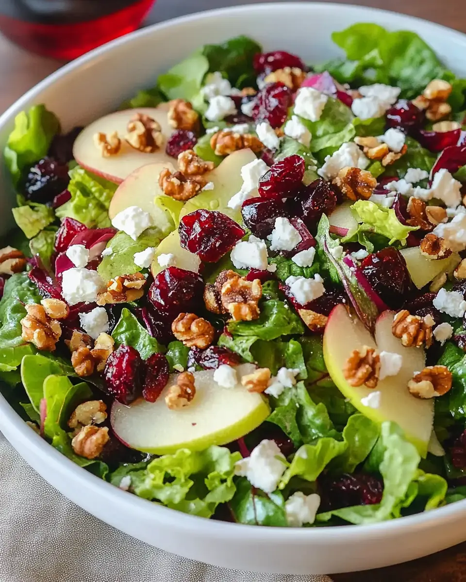 - In a large bowl, combine mixed greens, walnuts, dried cranberries, feta cheese, red onion, and diced apple.