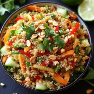 - In a large bowl, combine cooked quinoa, chopped vegetables, peanuts, and sesame seeds.