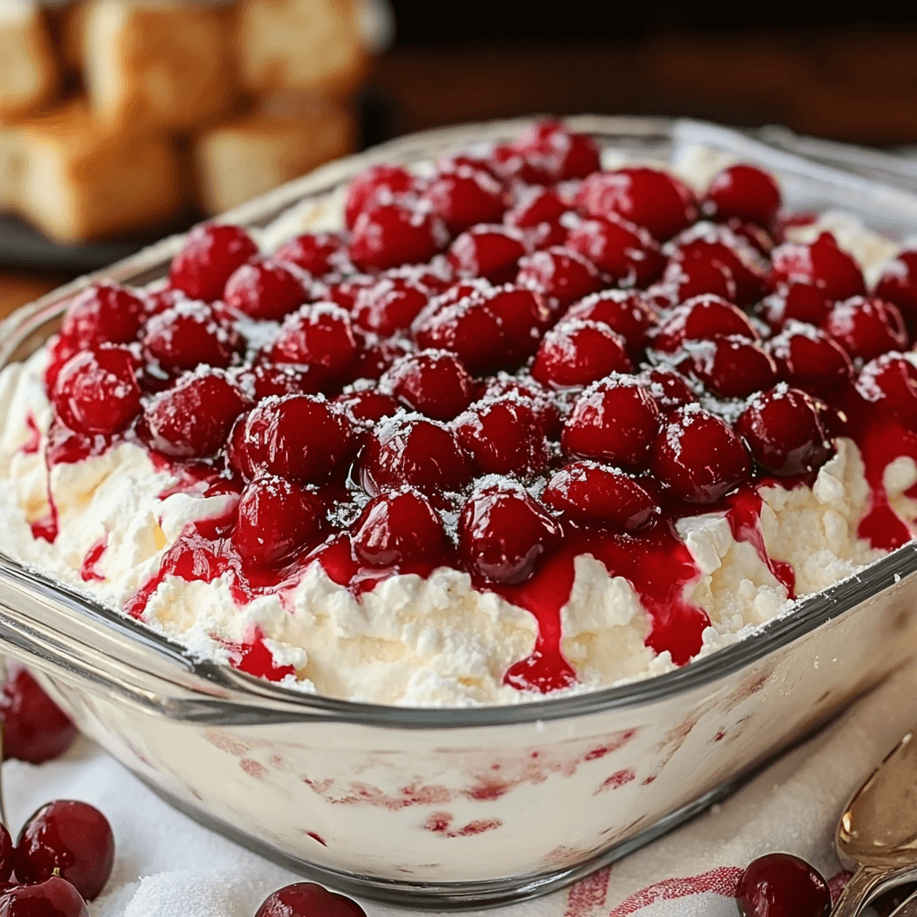 What makes this recipe special? It’s the perfect balance of sweet and tart, light and creamy. The cream cheese frosting adds a rich, tangy depth that perfectly complements the sweetness of the cherries. The angel food cake provides a delicate lightness that prevents the dessert from becoming too heavy. And let’s be honest, the stunning presentation is a major bonus! This dessert is incredibly quick to assemble, perfect for last-minute gatherings or a spontaneous sweet treat. It’s so easy, even your kids could help (with supervision, of course!). This dessert evokes feelings of pure joy and comfort – the kind of treat that makes you smile from the first bite to the last.