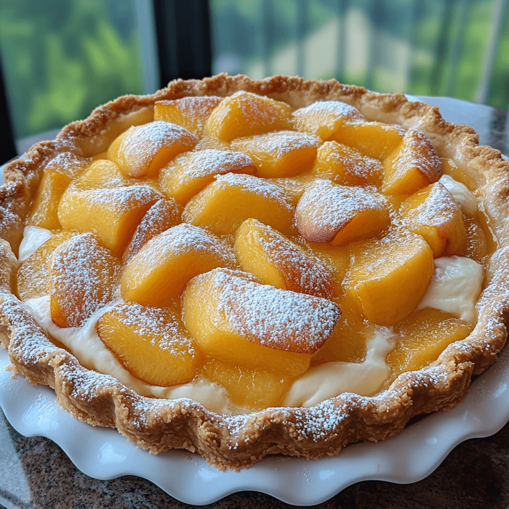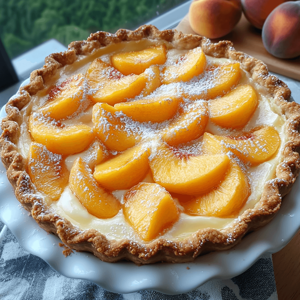 - Assemble the Pie: Arrange the sliced peaches in the pre-baked pie crust. Pour the cream mixture evenly over the peaches.
