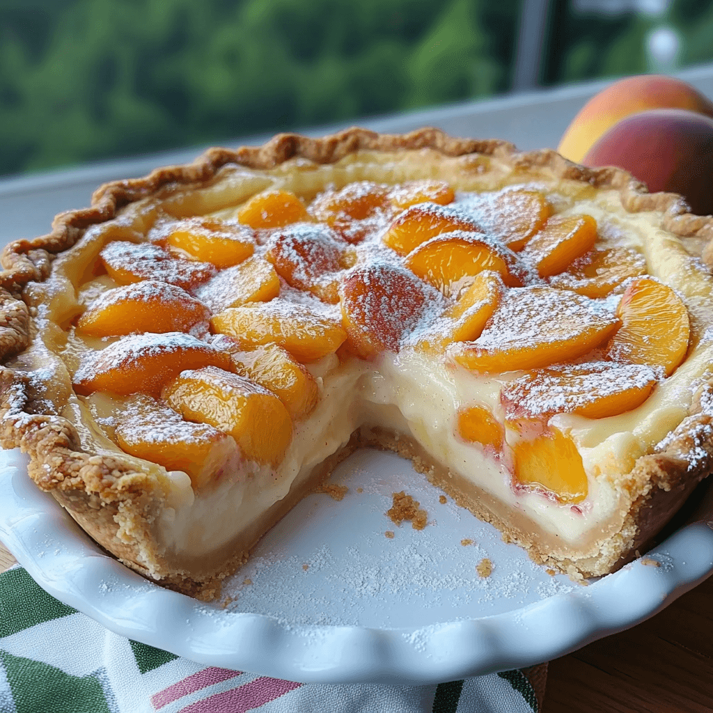 - Assemble the Pie: Arrange the sliced peaches in the pre-baked pie crust. Pour the cream mixture evenly over the peaches.