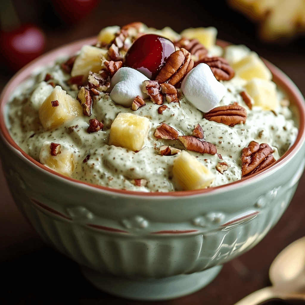- Garnish and serve: Before serving, garnish your Pistachio Pineapple Fluff with extra chopped nuts and pineapple chunks. Serve chilled and enjoy!