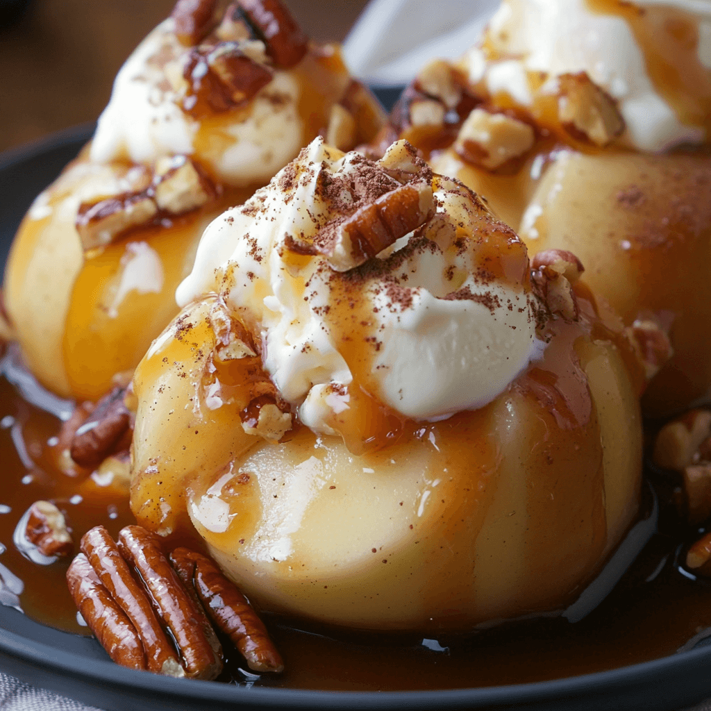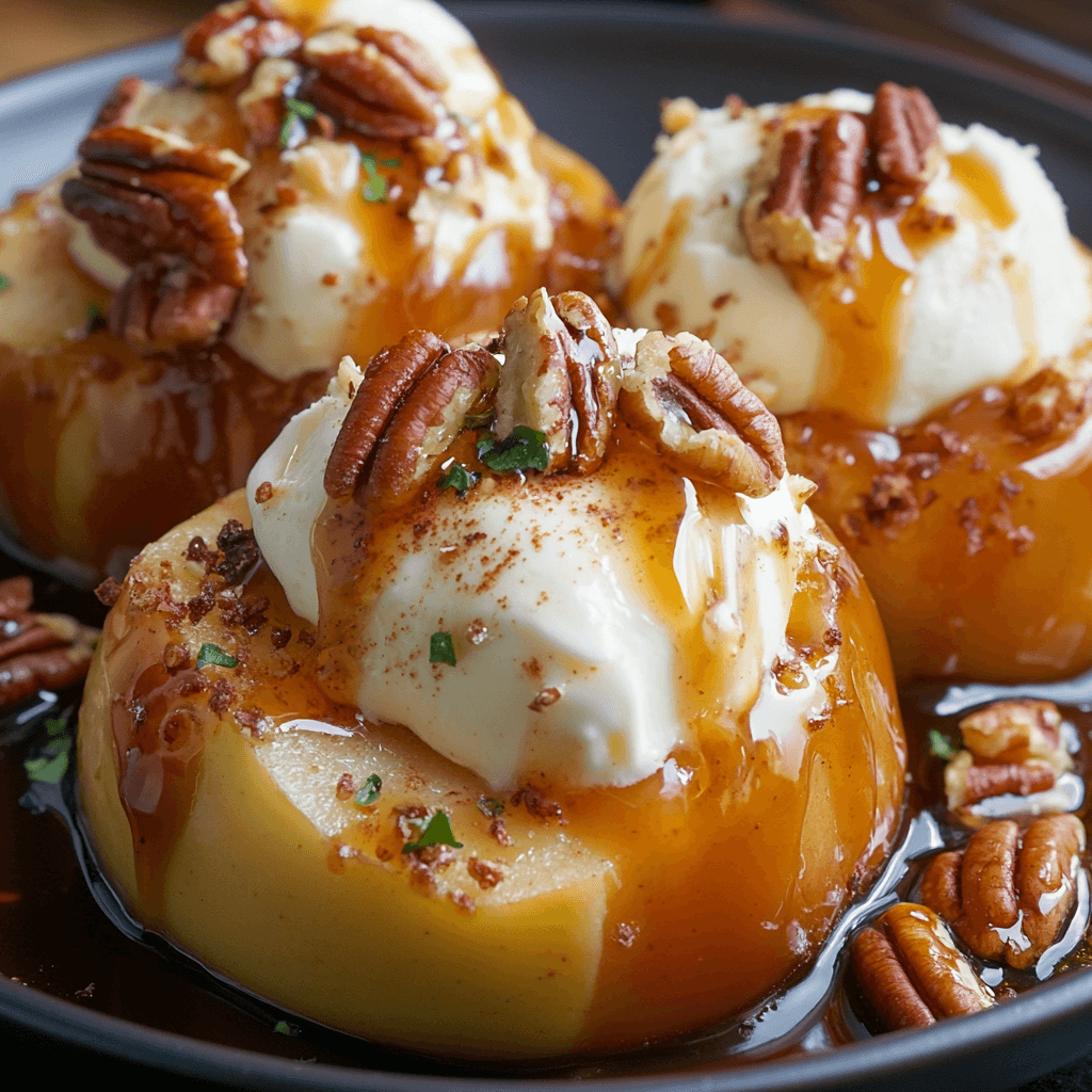 - Top and Serve: Sprinkle the toasted pecans over the caramel-drizzled apples. Serve immediately with a scoop of vanilla ice cream.