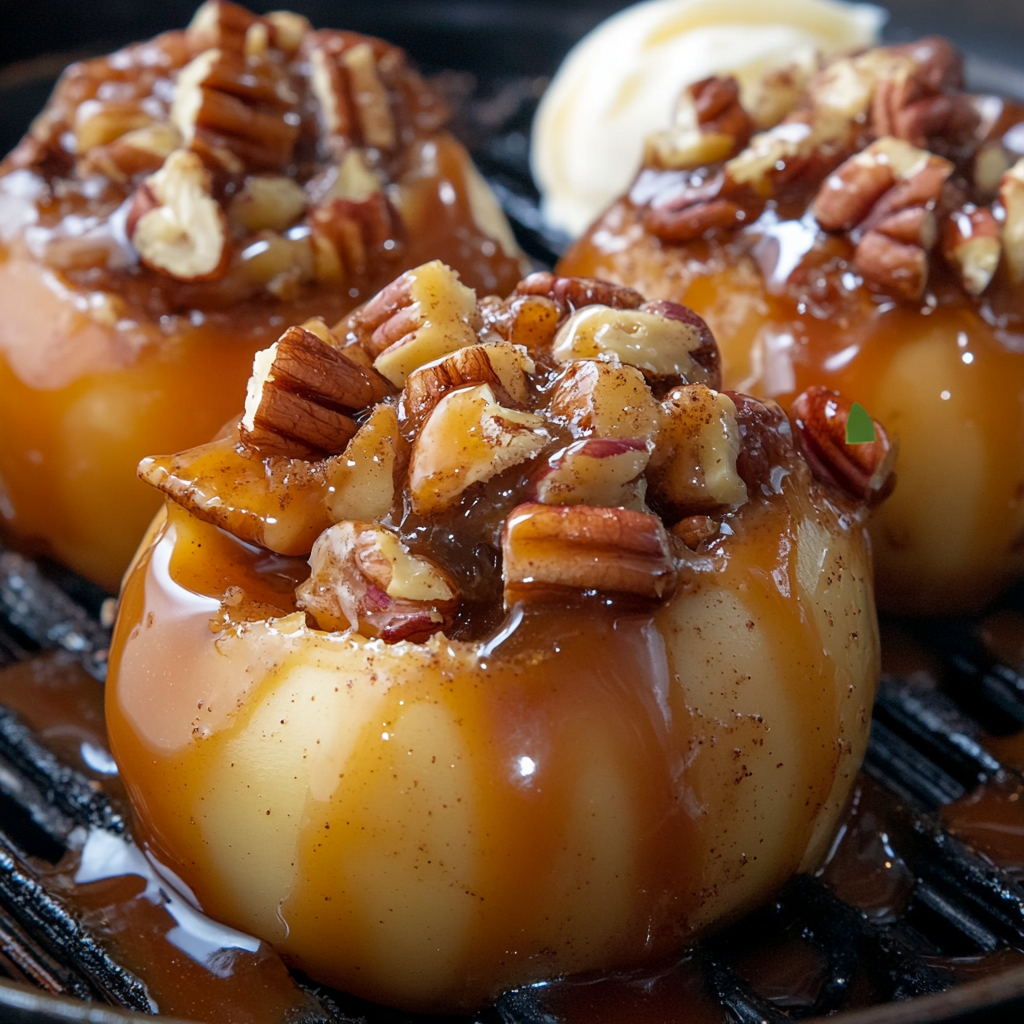 - Top and Serve: Sprinkle the toasted pecans over the caramel-drizzled apples. Serve immediately with a scoop of vanilla ice cream.