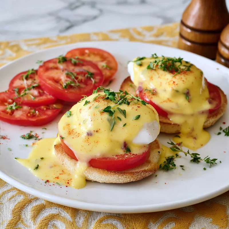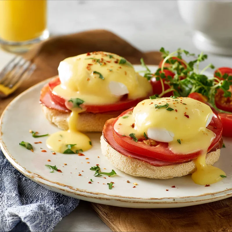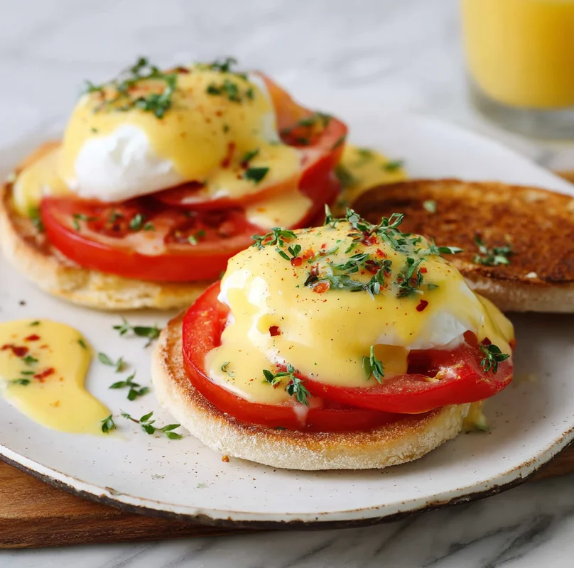- Build your Benedict: Place two English muffin halves on each plate. Top each muffin half with a slice of fresh tomato. Gently place a poached egg on top of the tomato.