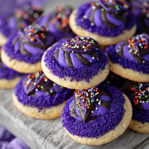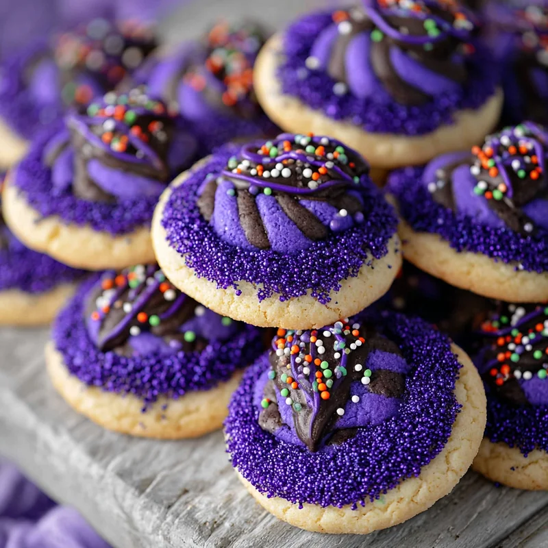- Now for the sparkle! Gently coat your assembled cookies with Halloween sprinkles or purple sanding sugar. Give them a light press so the sprinkles stick like they’re enchanted.