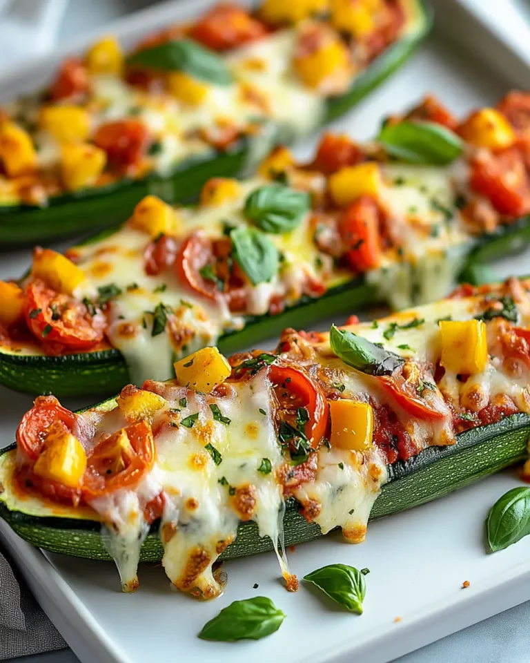Delicious zucchini boats filled with pizza toppings, perfect for a low-carb meal.
