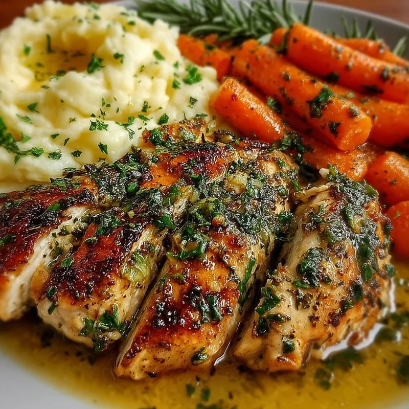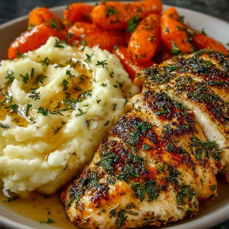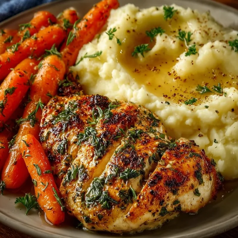 Easy Garlic Herb Chicken with Creamy Mashed Potatoes & Sweet Glazed Carrots