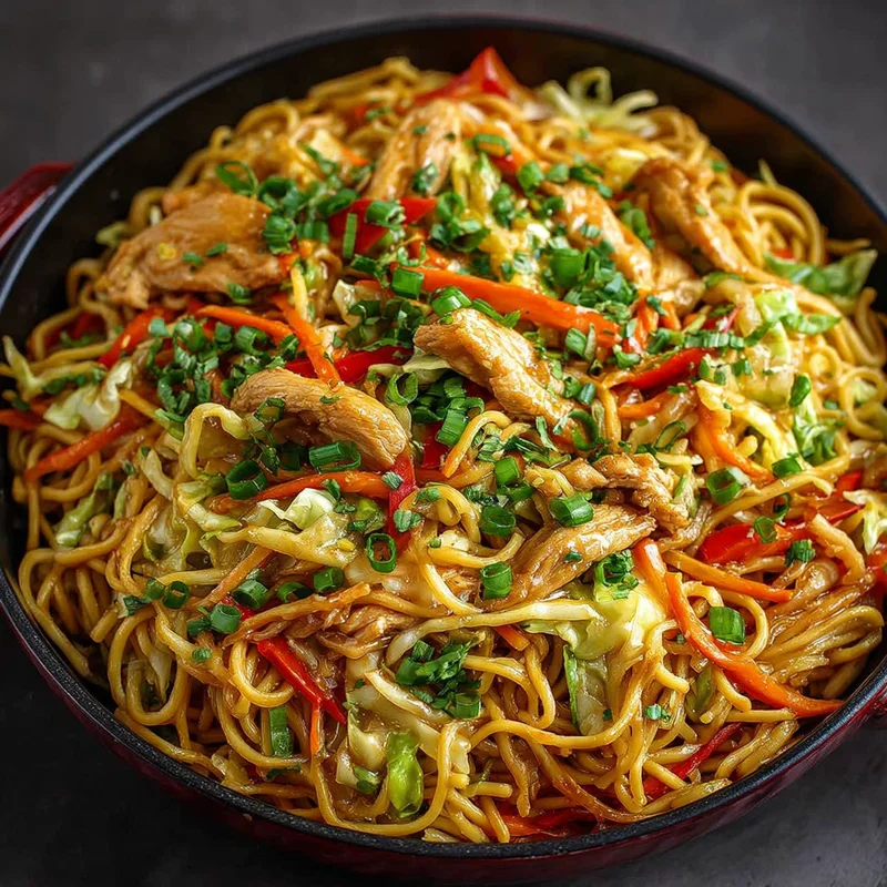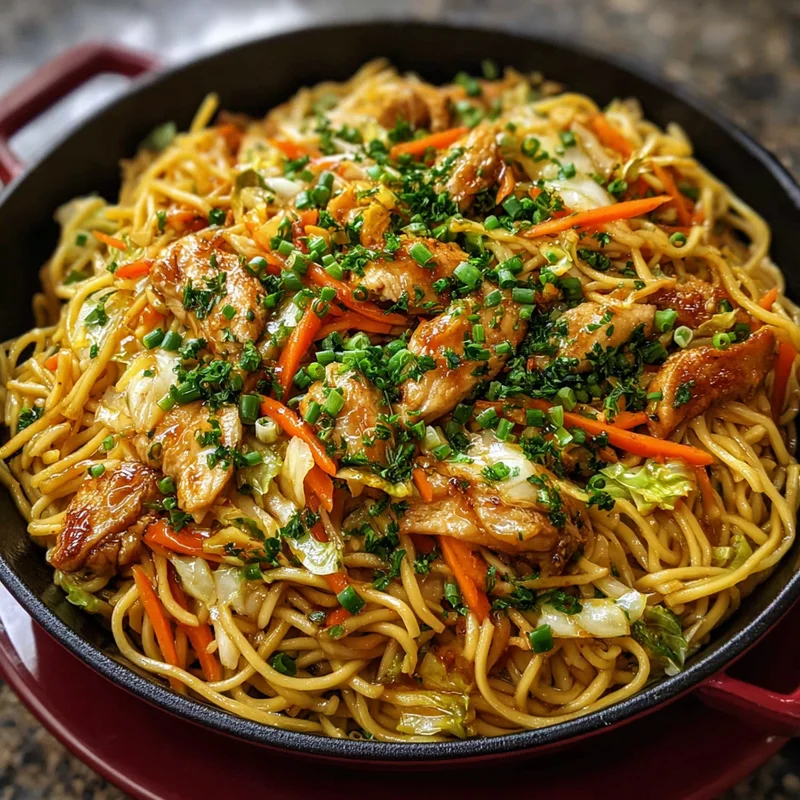 - Bring it All Together: Add your cooked chicken back into the skillet with the veggies. Now, add the uncooked chow mein noodles.