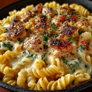 - Finally, add your drained, cooked pasta right into the skillet with the chicken and sauce. Give it a good toss, making sure every piece of pasta and chicken is coated in that glorious, cheesy sauce.1.5 lbs boneless, skinless chicken breasts