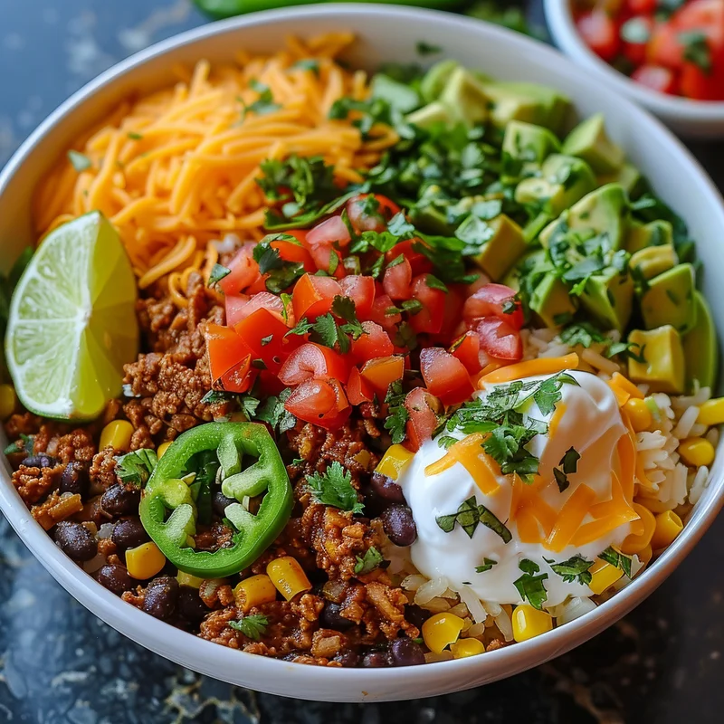 Let the assembled bowls cool down completely. Then, store them in airtight containers in the refrigerator. They should stay fresh for about 3-4 days. When you’re ready to eat, you can either reheat the whole bowl in the microwave (lettuce might get a little wilted, but still tasty!) or gently warm the meat and rice mixture on the stovetop or in the microwave and then top with fresh lettuce and cheese.