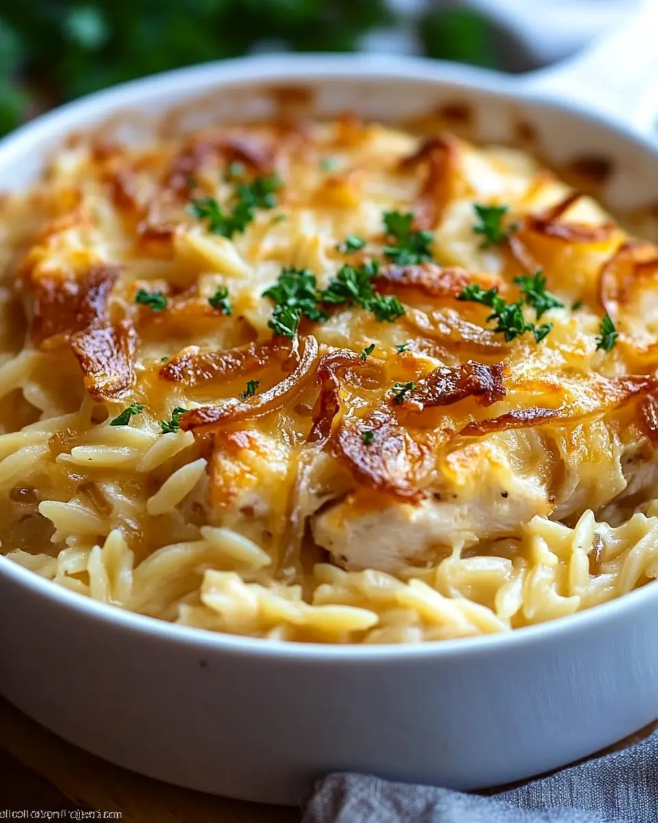 A comforting and flavorful casserole that combines tender chicken, orzo pasta, and the rich taste of French onion soup.