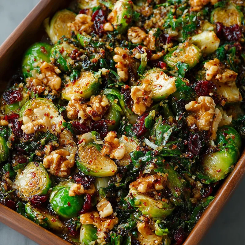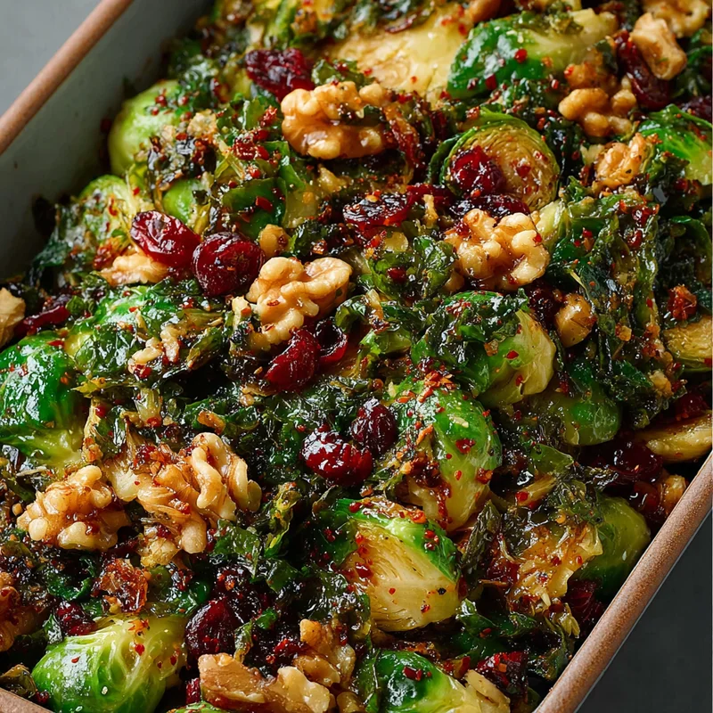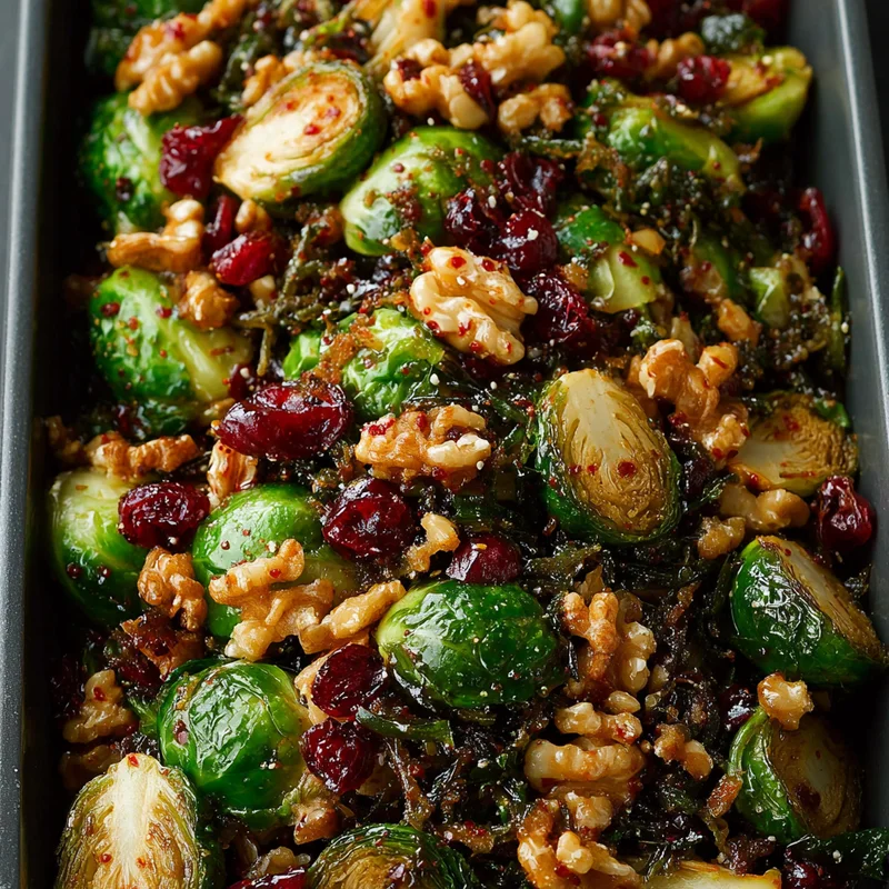- Add the crunch and chew: Carefully pull the baking sheet out of the oven. Scatter your chopped walnuts and dried cranberries over the sprouts. Give everything a gentle toss right there on the sheet to get them mingled.