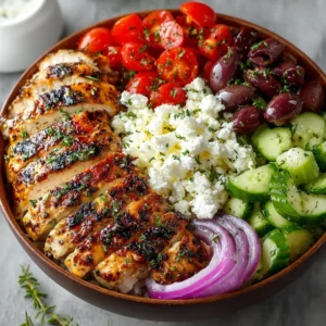 - Add the fresh veggies: Now for the color and crunch! Scatter your diced cucumber, halved cherry tomatoes, sliced Kalamata olives, and thinly sliced red onion all around the chicken. I like to try and get a little bit of everything in each bite.