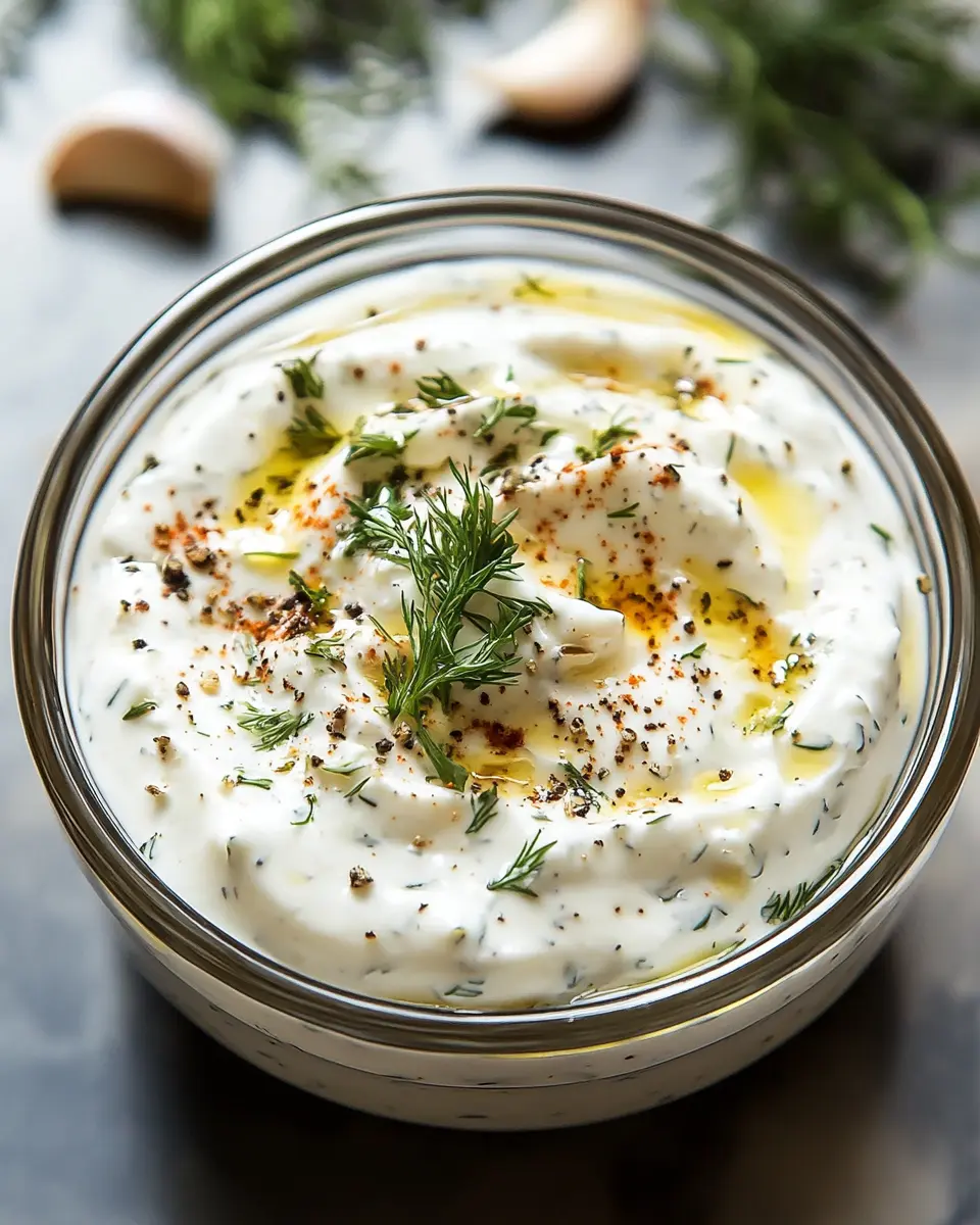 - In a bowl, mix together Greek yogurt, olive oil, lemon juice, garlic, oregano, paprika, salt, and black pepper.