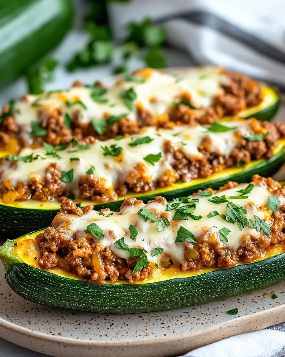Deliciously stuffed zucchini boats filled with ground beef, spices, and cheese for a hearty meal.