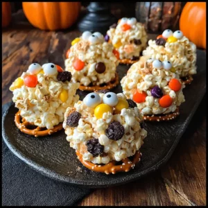 - Add Some Spooky Flair (Optional): If you’re using candy eyes, now’s the time to gently press them onto your popcorn balls to give them a fun, spooky face.