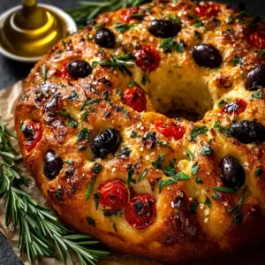 - Bake to Perfection: Drizzle the entire wreath generously with extra olive oil and sprinkle with flaky sea salt. Bake for 20-25 minutes, or until the focaccia is golden brown and cooked through.