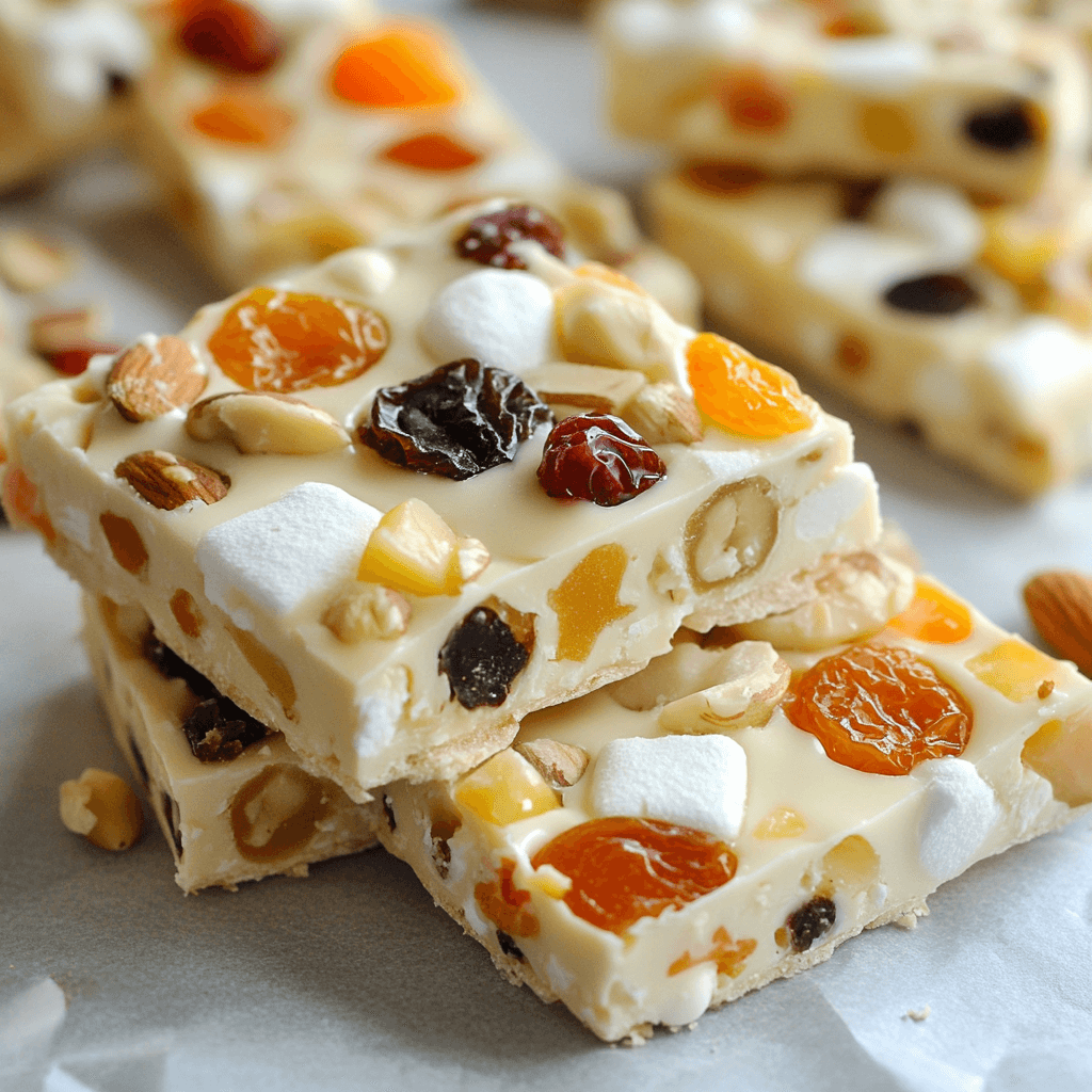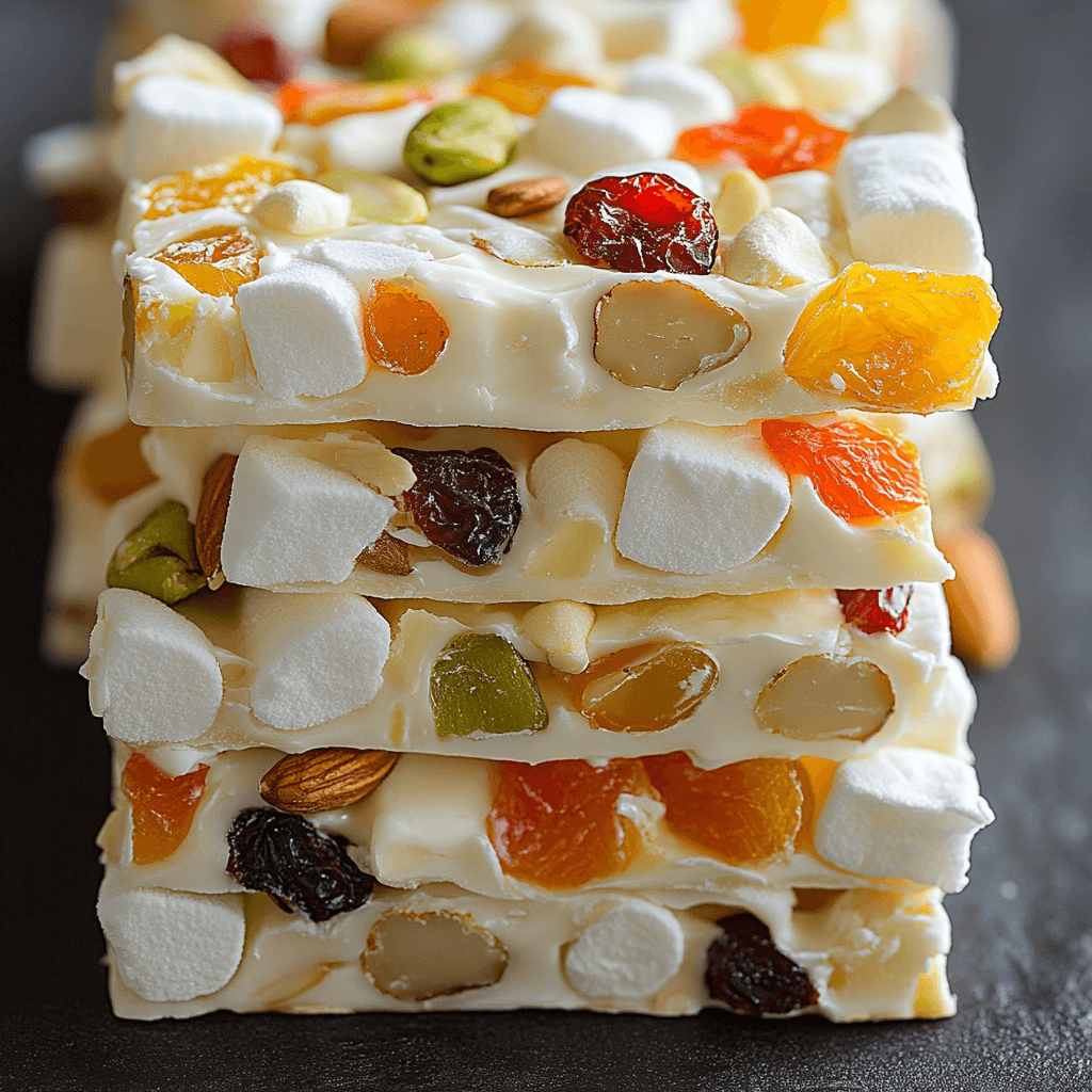 These ingredients are simple and easy to find in most grocery stores, making this recipe perfect for those last-minute dessert cravings. White chocolate provides the creamy base of the nougat, while the marshmallows give it that signature chewy texture. The sweetened condensed milk binds everything together, and the dried fruits and nuts bring a wonderful crunch and chew to each bite.