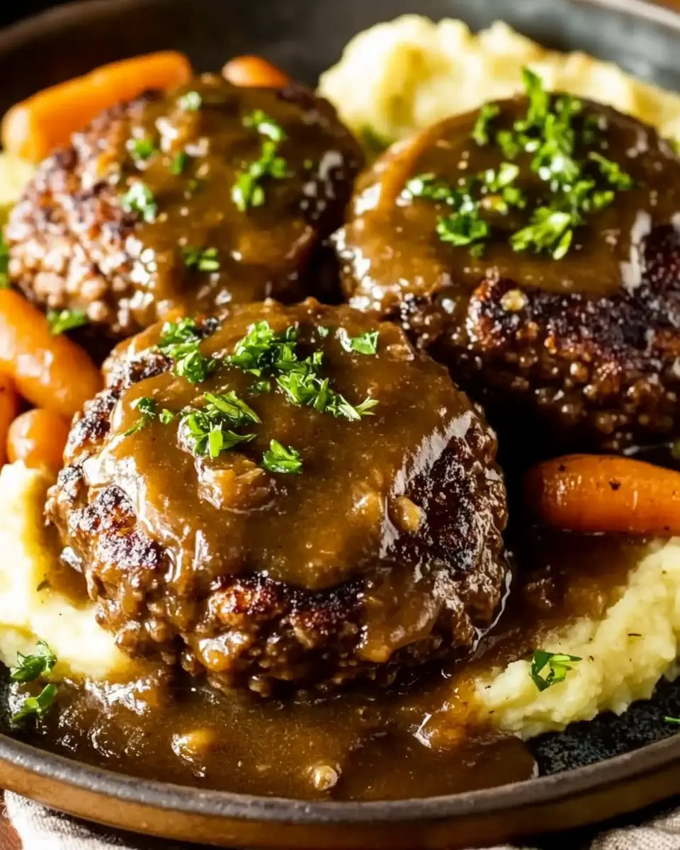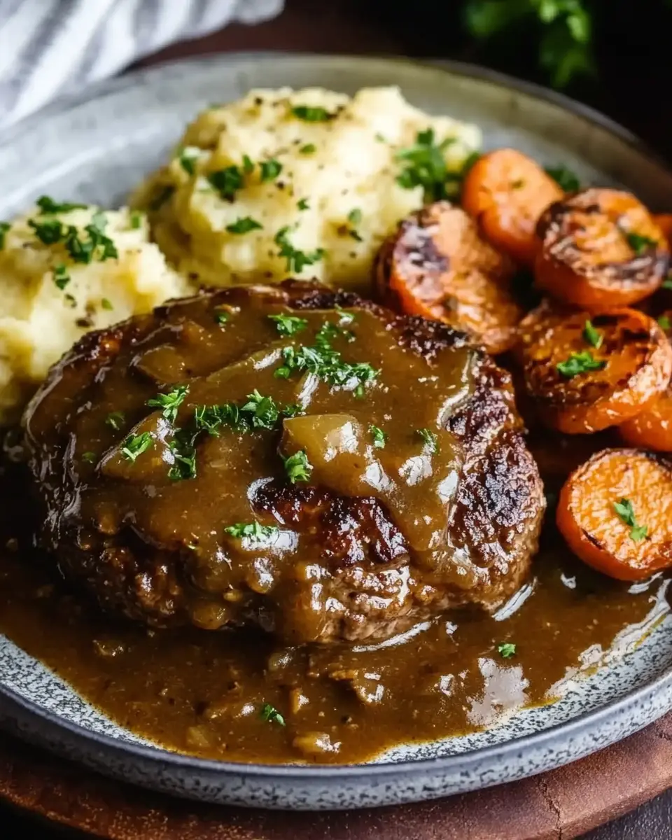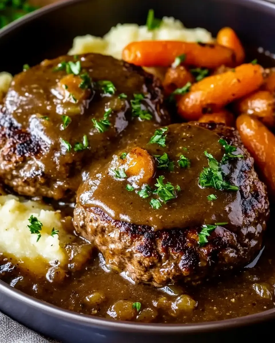 Homemade Salisbury Steak is not only delicious but also provides a well-rounded nutritional profile. Each serving contains approximately 350 calories, making it a satisfying choice for dinner. With 22 grams of total fat, including 8 grams of saturated fat, it’s a hearty meal, especially when paired with lighter sides. The dish also packs in 25 grams of protein, making it an excellent option for those looking to maintain their energy levels throughout the day. This balance of nutrients ensures you enjoy comfort food without compromising on nutrition.
