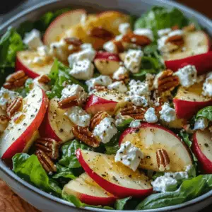 - Assemble the salad: In a large bowl, combine the mixed greens, sliced apples, red onion, dried cranberries (or pomegranate seeds), and toasted nuts. Gently toss to combine.