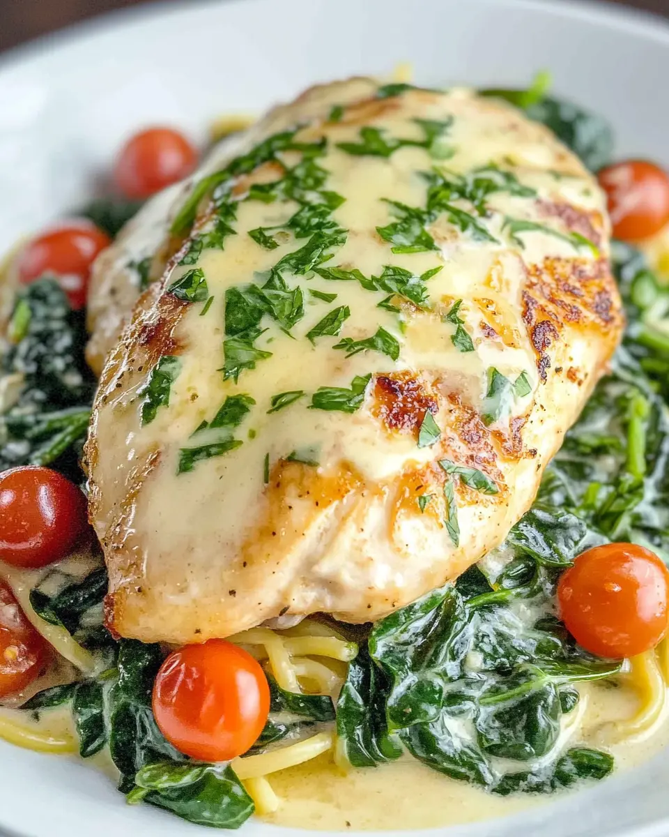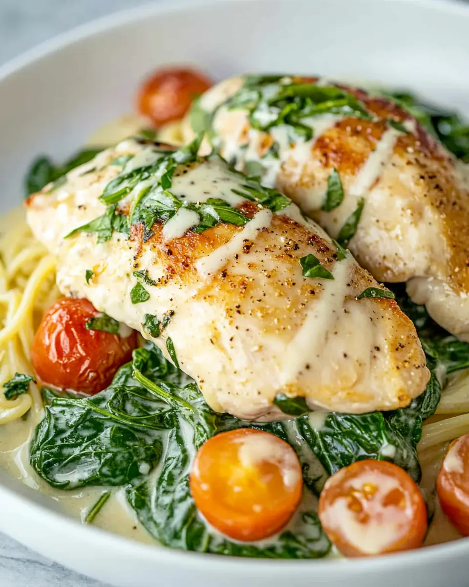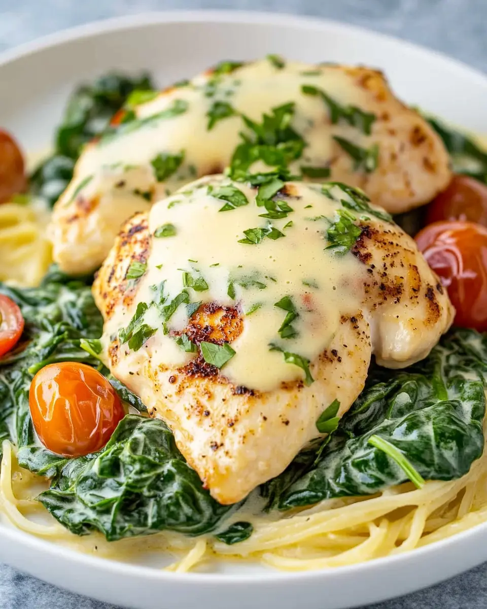 To elevate the presentation, consider garnishing your chicken florentine with freshly grated Parmesan cheese and a sprinkle of chopped parsley. Serving it in a colorful bowl or on a rustic plate can make the dish visually appealing, impressing your guests and making your weeknight dinner feel special.