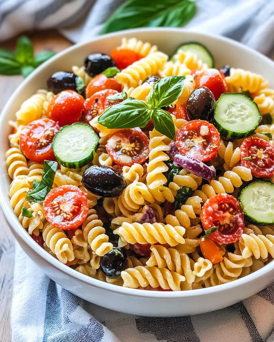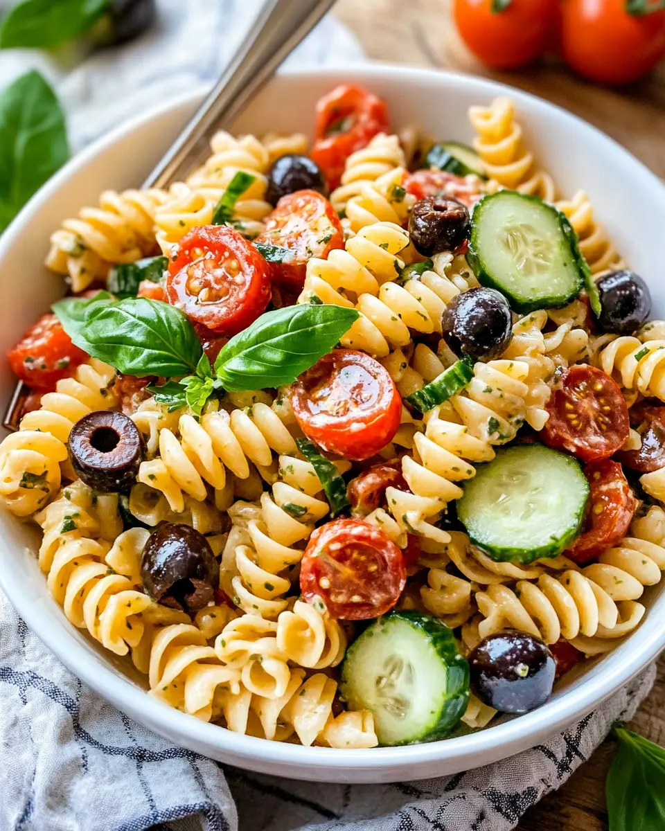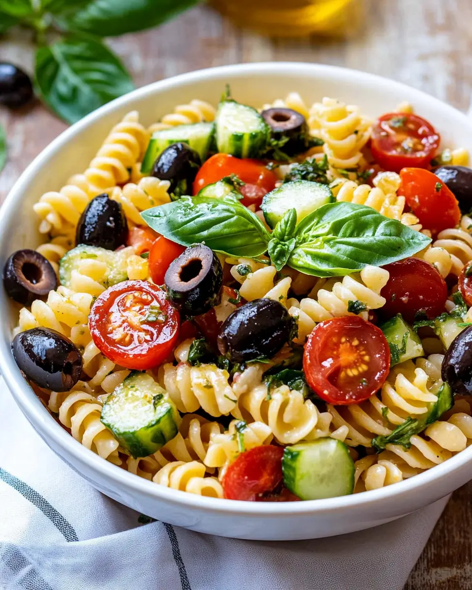 - In a large bowl, combine the pasta, cherry tomatoes, cucumber, olives, red onion, mozzarella, and basil.