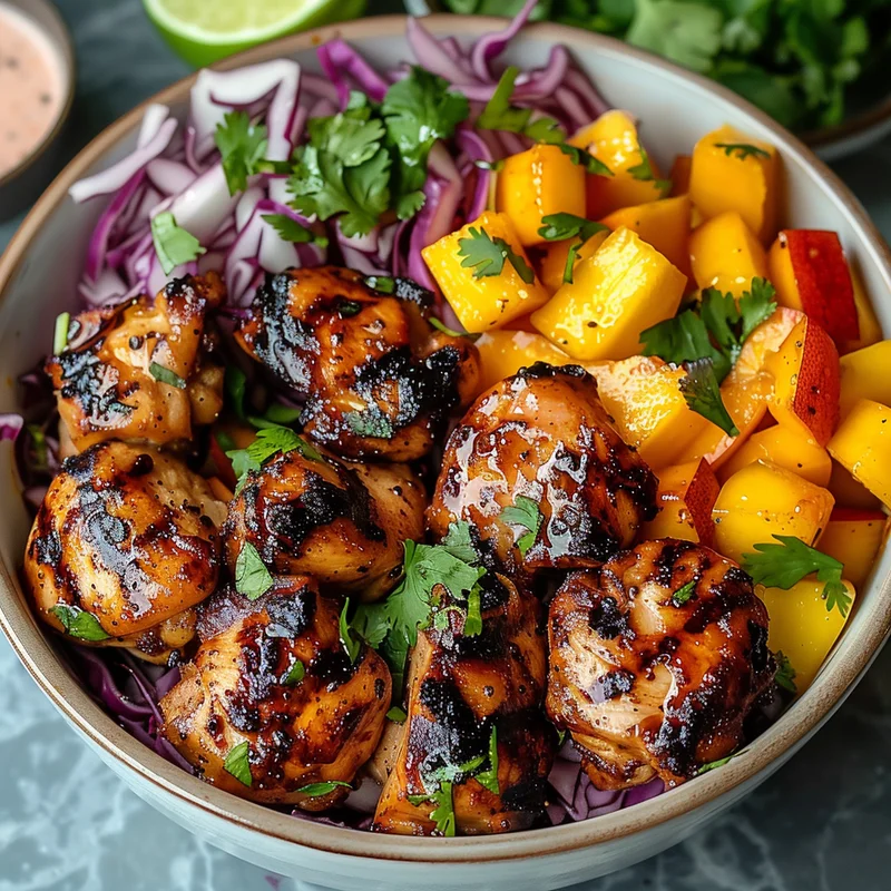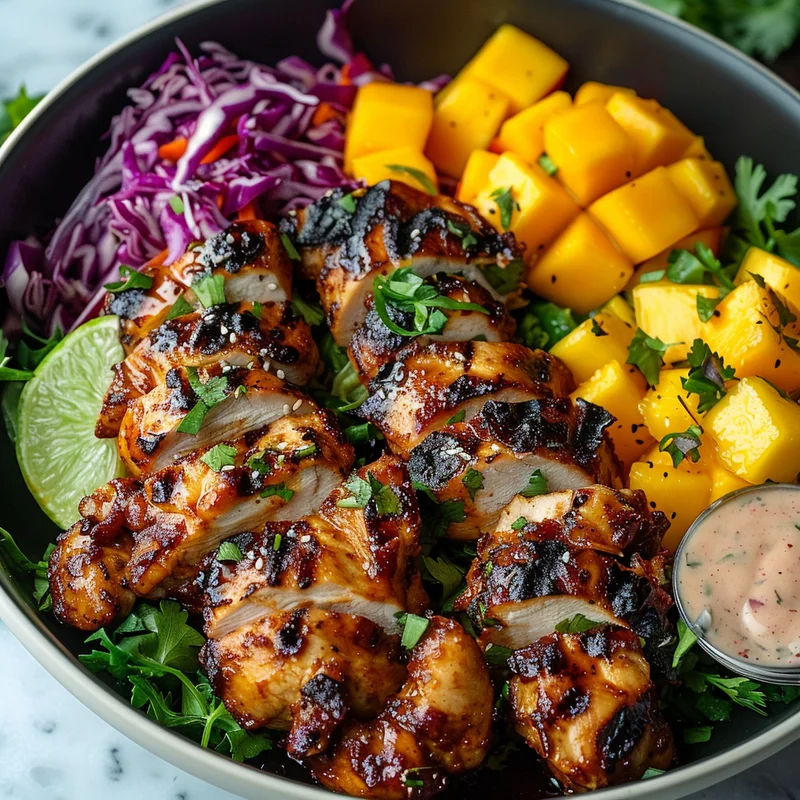 - Assemble your masterpiece! Divide the beautiful mango slaw among your bowls. Then, artfully arrange the sliced jerk chicken over the top.