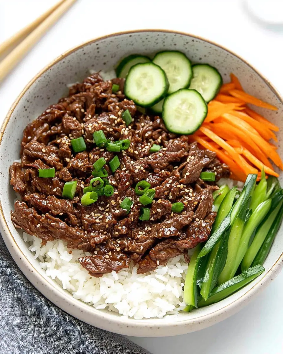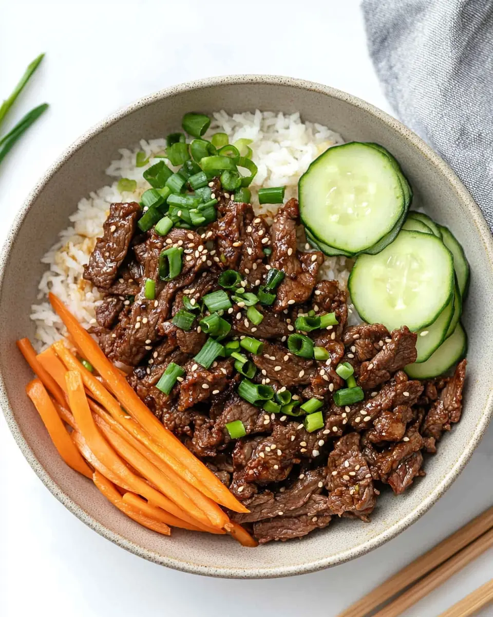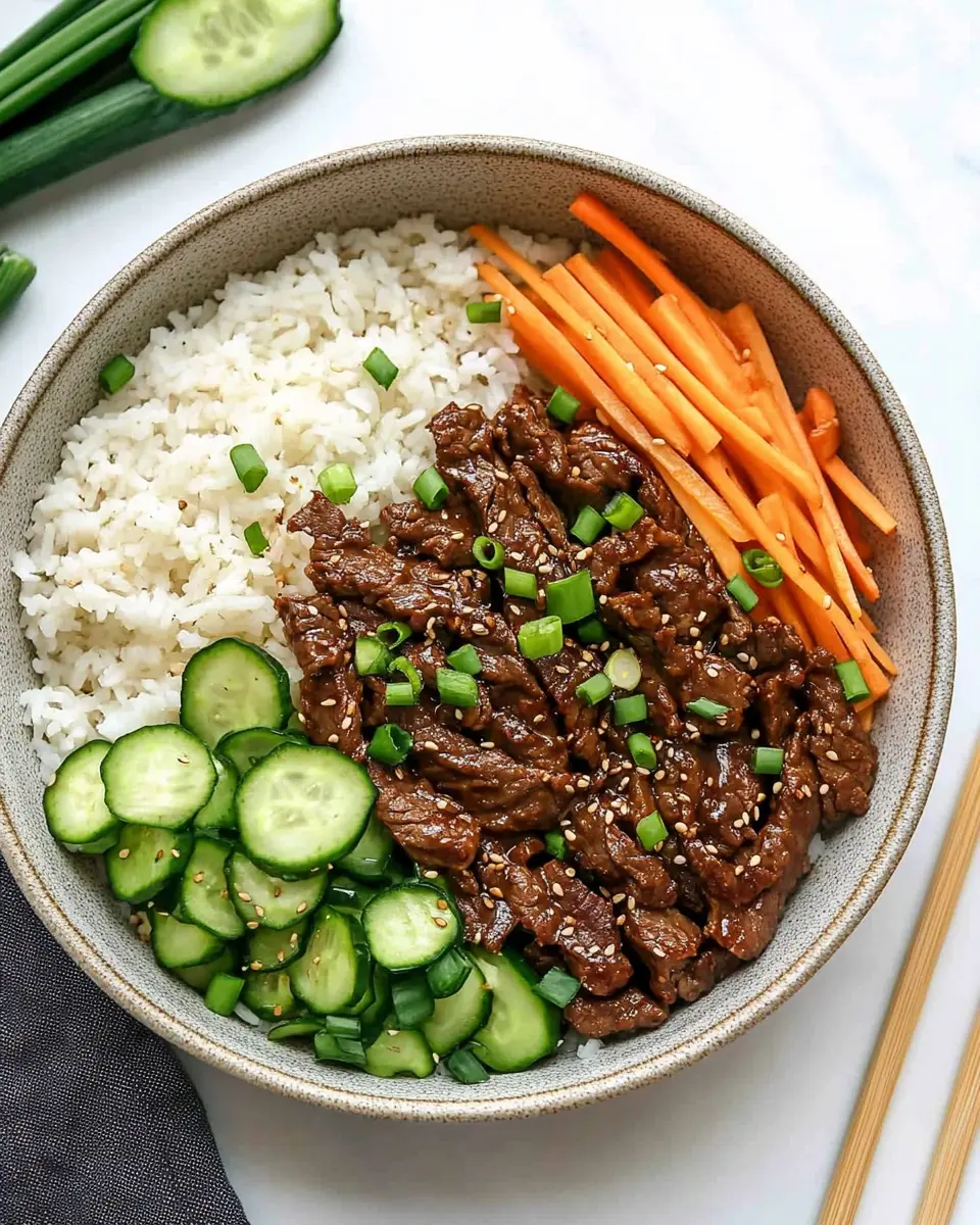 This Korean Beef Bowl is a savory dish featuring tender beef cooked in a flavorful sauce served over rice with fresh vegetables.