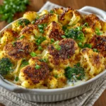 A warm, cheesy, and comforting casserole made with cauliflower, broccoli, and a creamy sauce, topped with melted cheddar and crispy panko breadcrumbs.