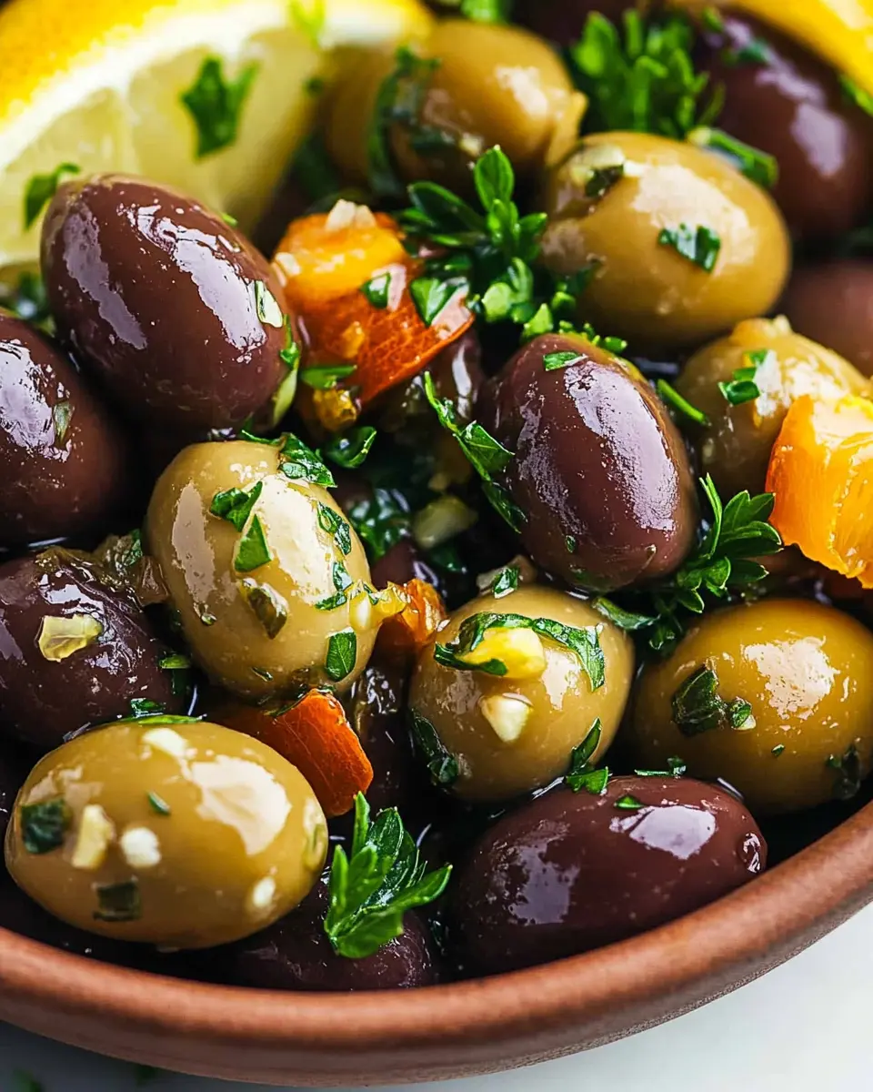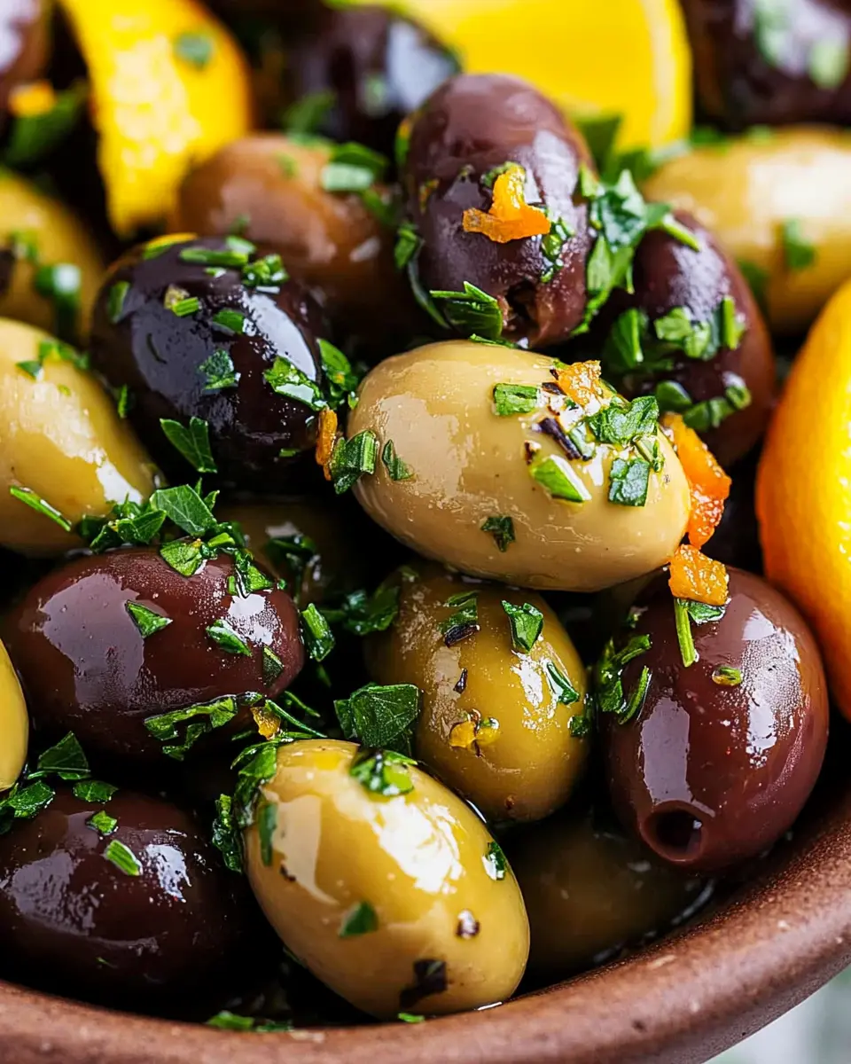 These marinated olives are infused with the bright flavors of herbs, garlic, and citrus, making them a perfect appetizer or snack.