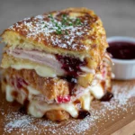 As soon as they’re done, transfer your hot, glorious Monte Cristo sandwiches to plates. Dust them generously with powdered sugar – don’t be shy! Serve them immediately with a side of raspberry jam for dipping. Ah, pure bliss!