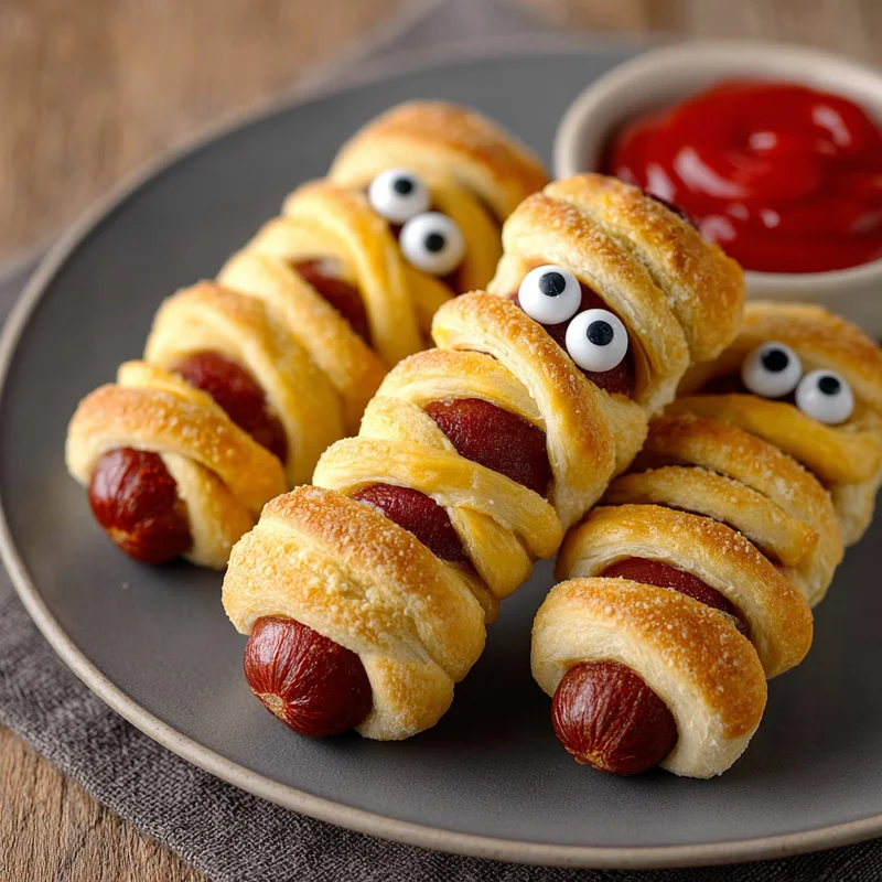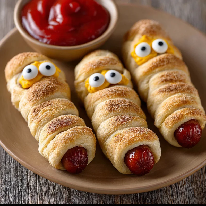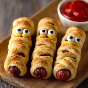 - Prep Ahead: You can wrap the hot dogs and place them on the baking sheet a few hours before you plan to bake them. Cover them loosely with plastic wrap and keep them in the refrigerator. Just add the eyes right before serving!