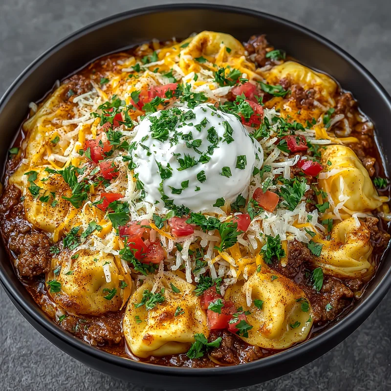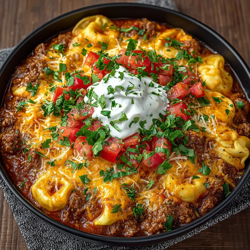 One-Pot Cheesy Enchilada Tortellini with Beef